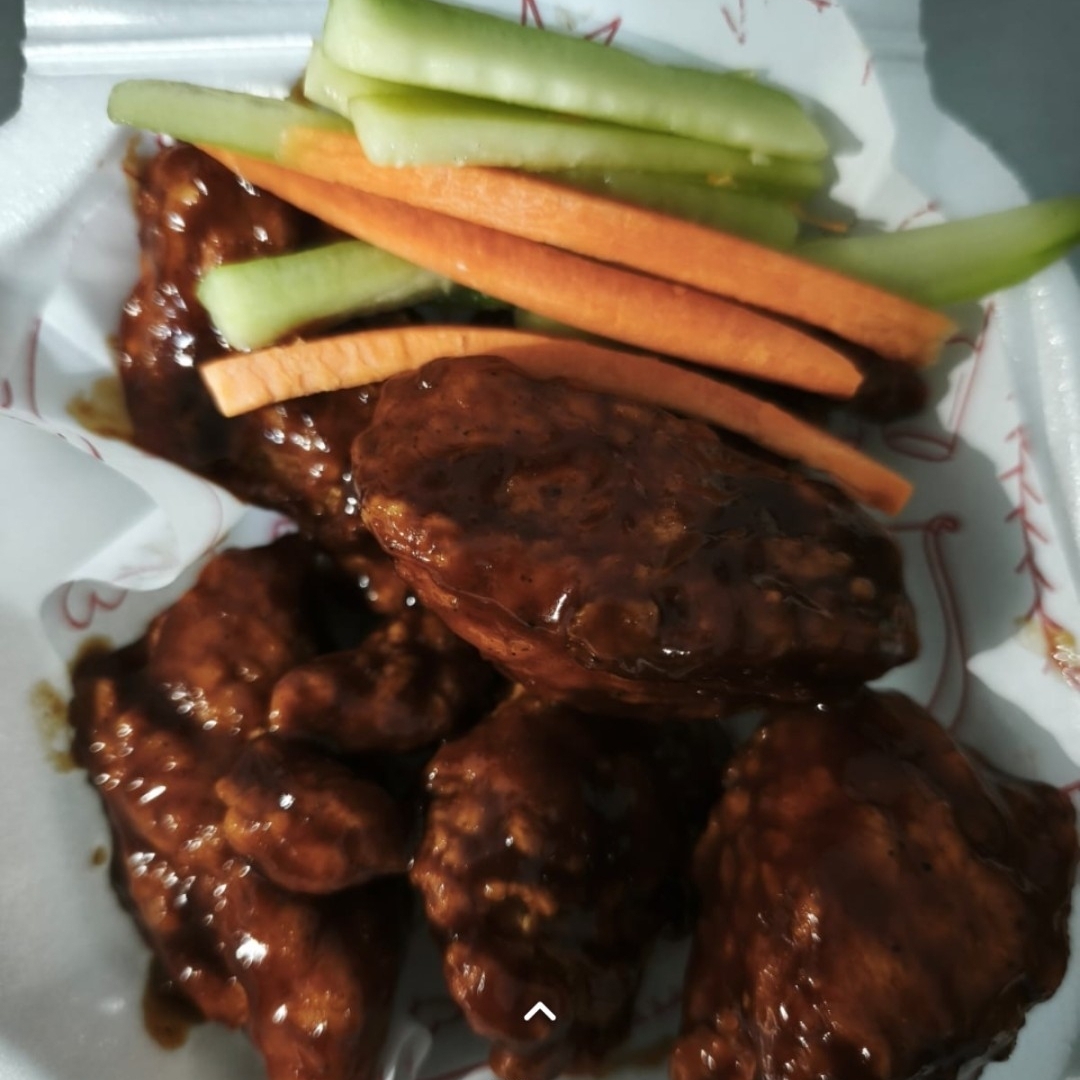 Orden de 5 alitas bañadas en la salsa de tu elección BBQ, red hot, mango habanero, buffalo Acompañadas de aderezo ranch y vegetales mango habanero