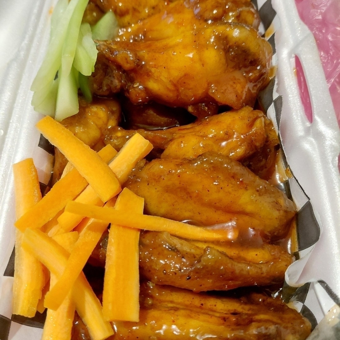 Alitas 20 piezas bañadas en la salsa de tu elección Bbq, mango habanero, red hot, Buffalo, Acompañadas de aderezo ranch y vegetales