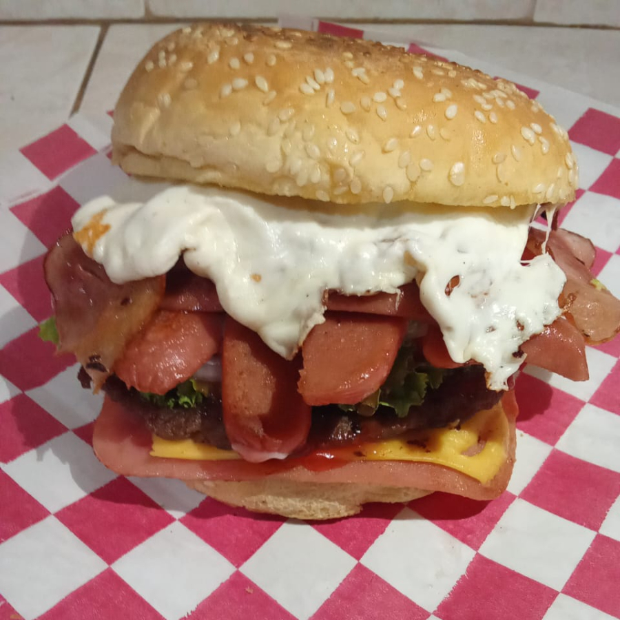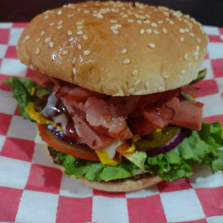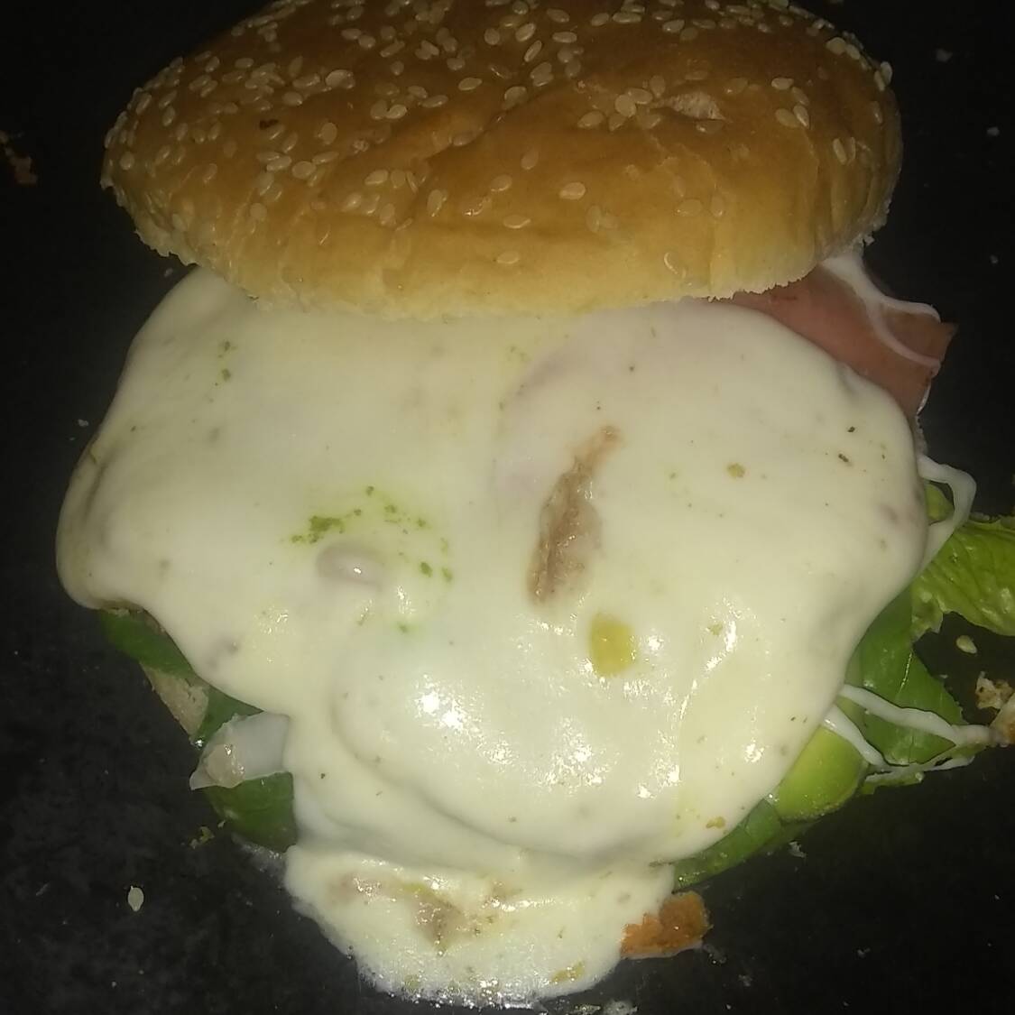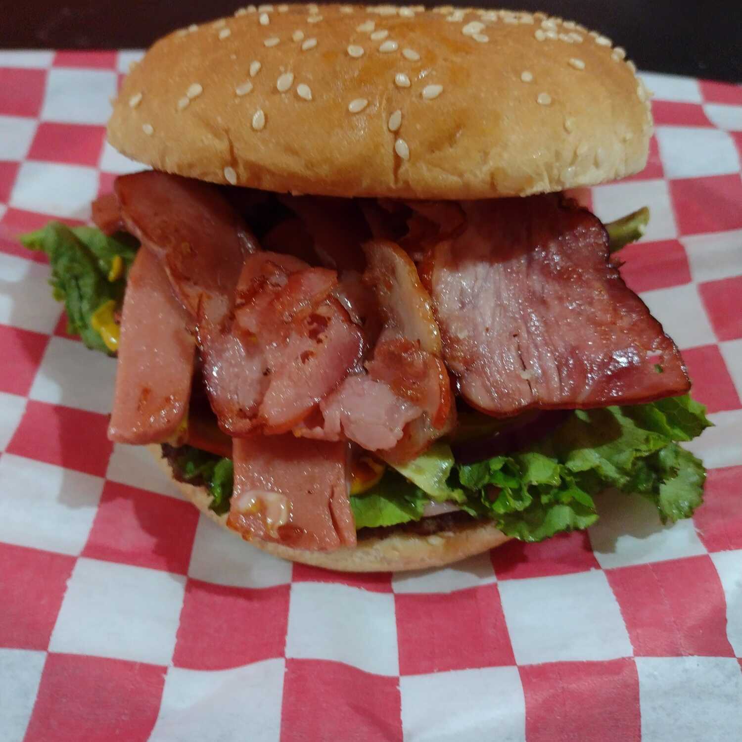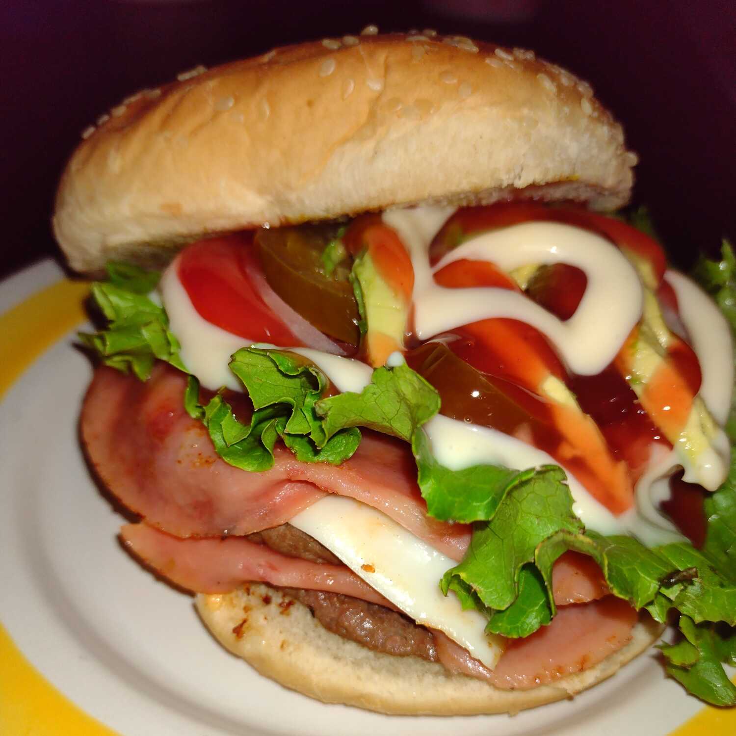 Doble carne, jamón, queso amarillo, queso blanco, lechuga, jitomate, cebolla, aguacate y aderezos.