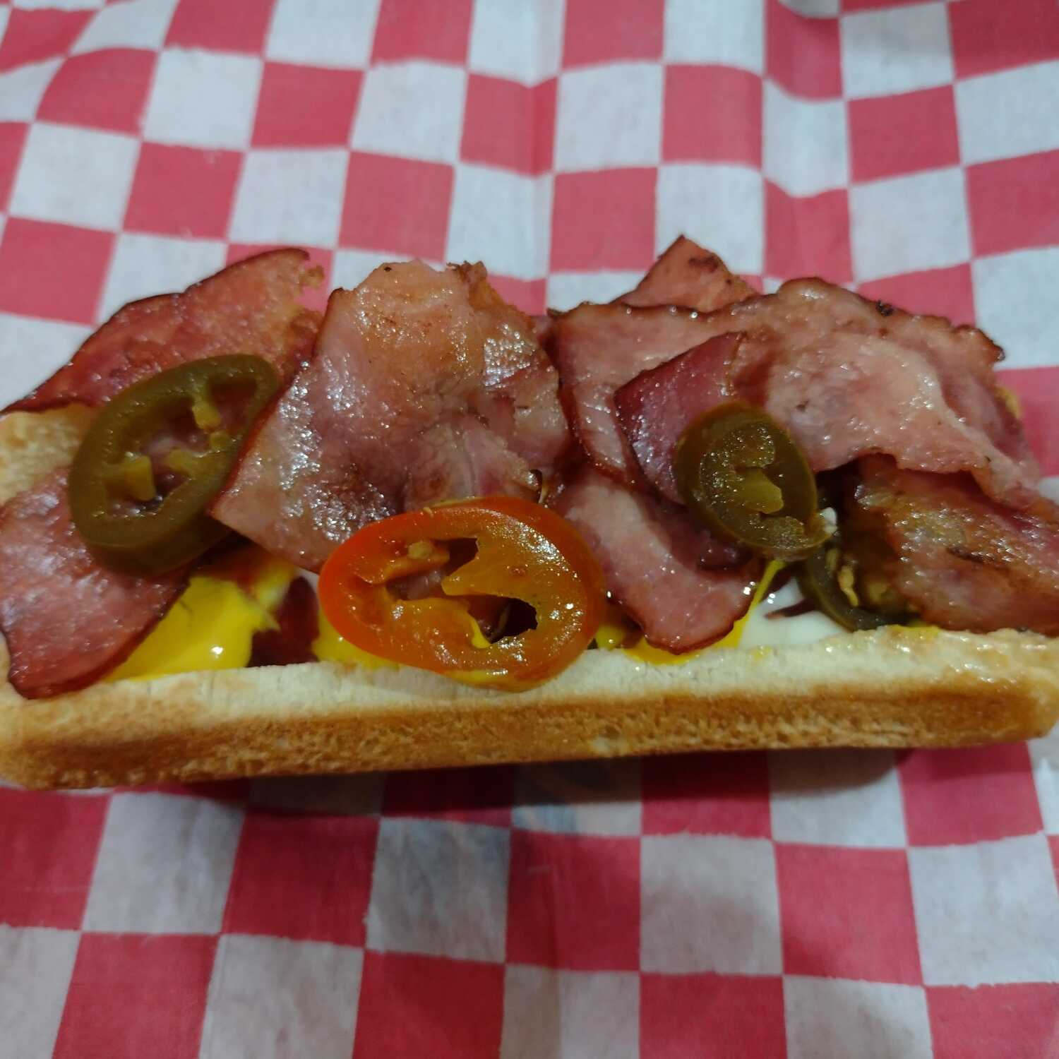 Carne res, tocino, jamón, queso amarillo, lechuga, jitomate, cebolla, aguacate y aderezos.