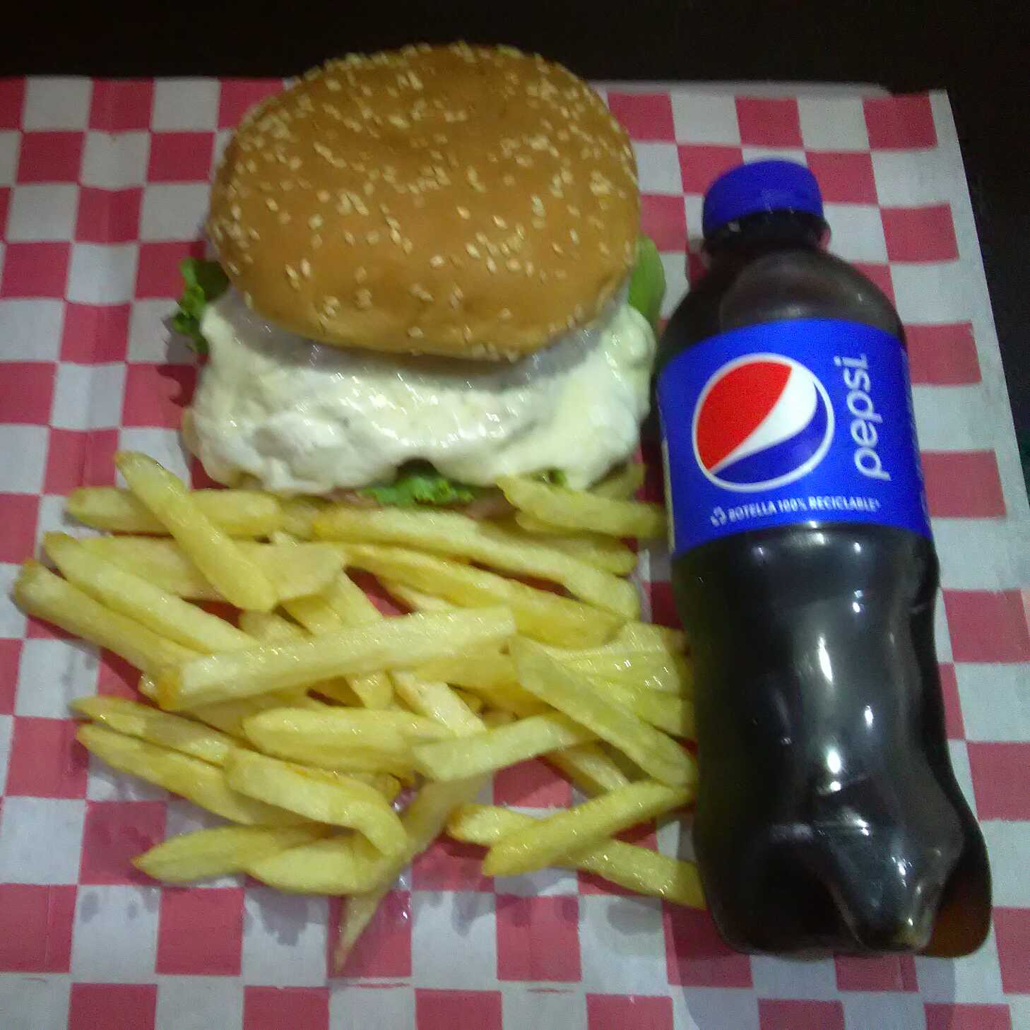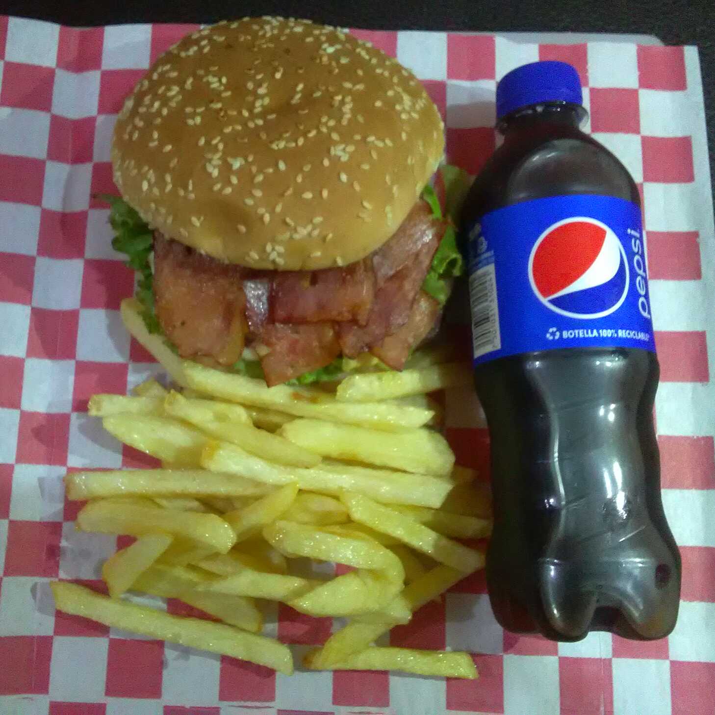 Hamburguesa con tocino, con papas, refresco 355ml.