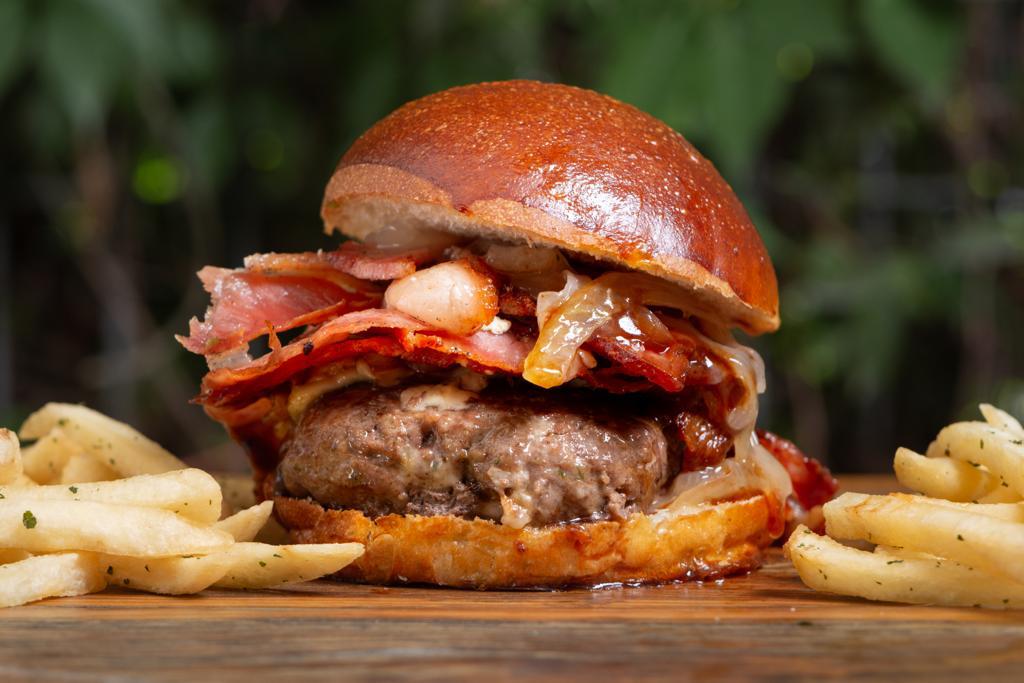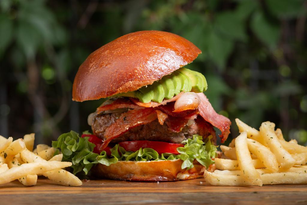 Bibis, molida de res preparada en casa, queso de cabra cenizo , cebolla caramelizada, bbq , estar tocino , lechuga , jitomate y aguacate.