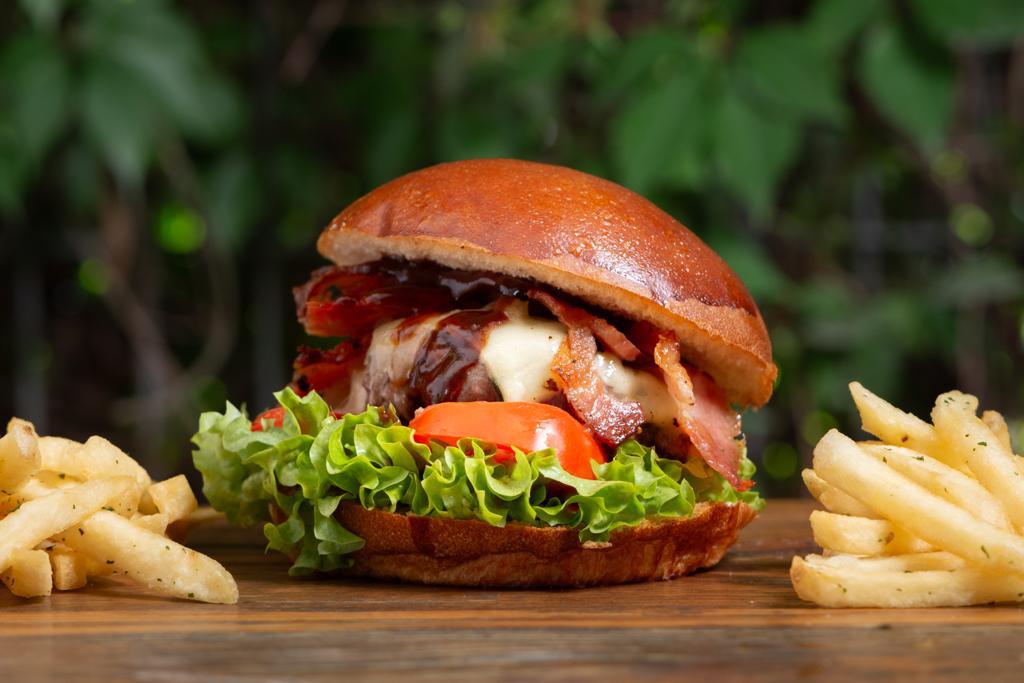 Molida de res preparada en casa , queso suizo, cebolla caramelizada, bbq, tocino, lechuga y jitomate.