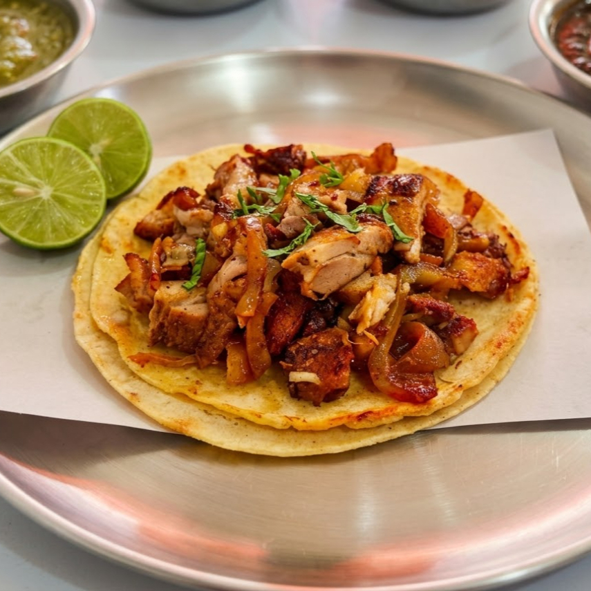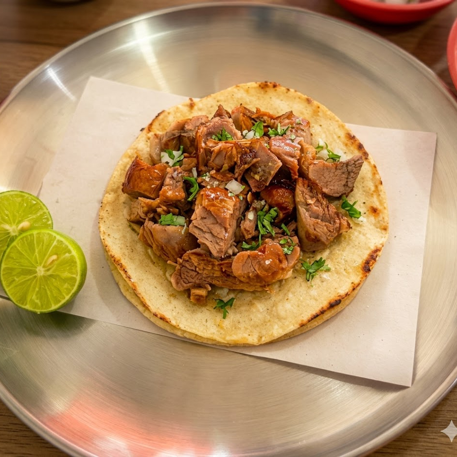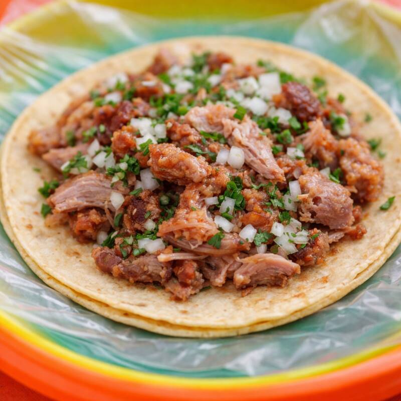 Delicioso taco servido en tortilla caliente con carnitas de tu elección.