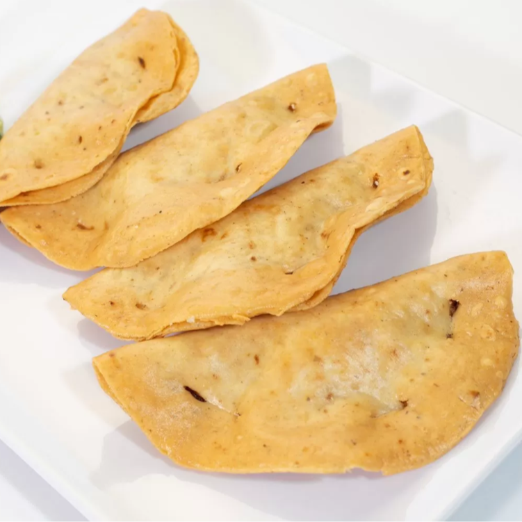 Taco frito a la perfección, crujiente por fuera y con relleno suave de sesos preparados.