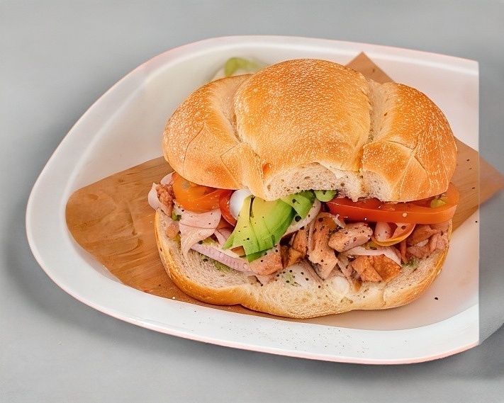 Torta de carnitas surtidas con aguacate, cebolla, jitomate y mayonesa. Acompañado con salsa y chiles en vinagre.