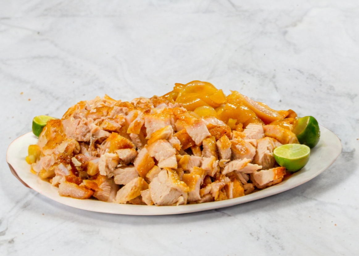 1/2 Kg de rico chicharrón acompañado de tortillas de maiz, pico de gallo, salsa y chiles en vinagre.