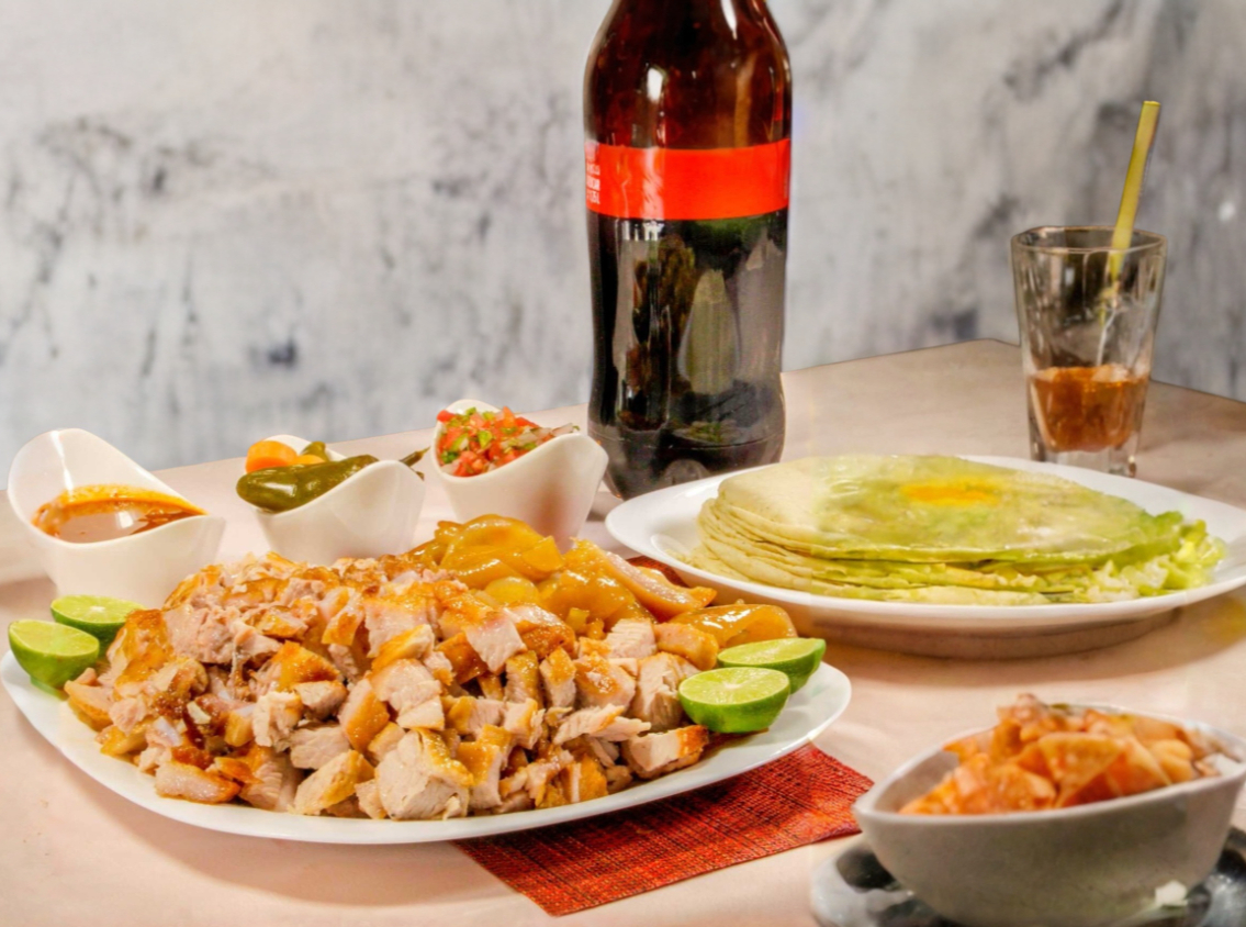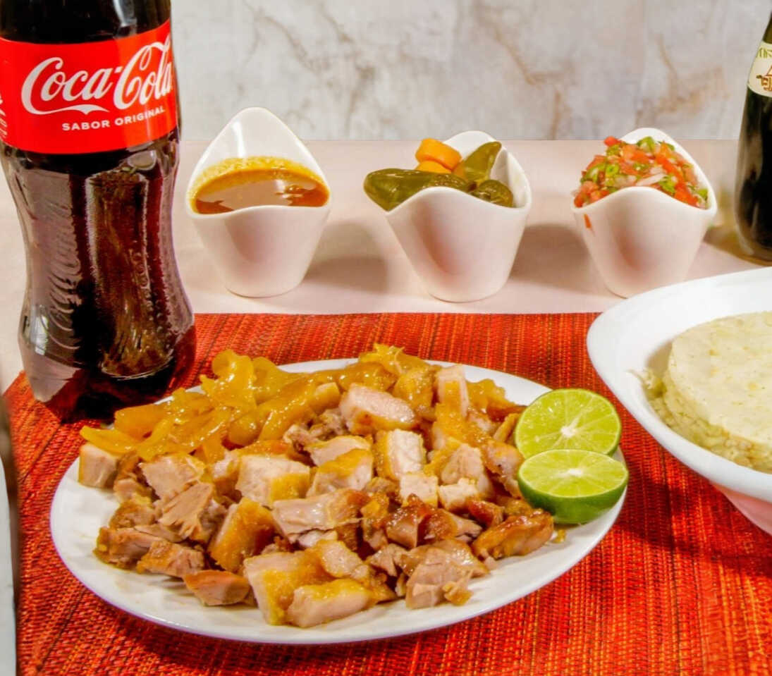 1/2Kg de carnitas surtidas con tortillas de maíz, 2 refresco de 600ml, 130 gr chicharron, pico de gallo, chiles en vinagre y salsa picante.