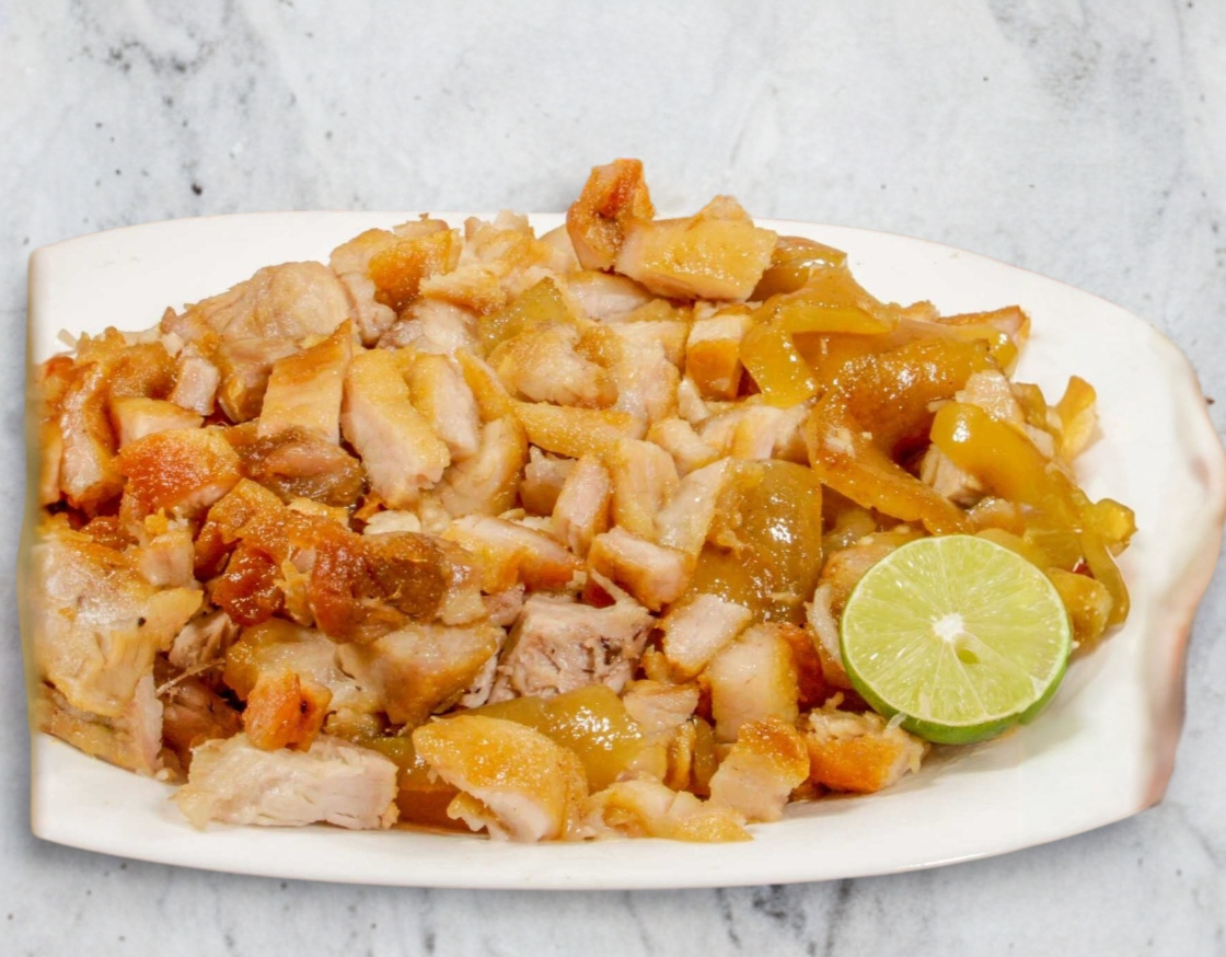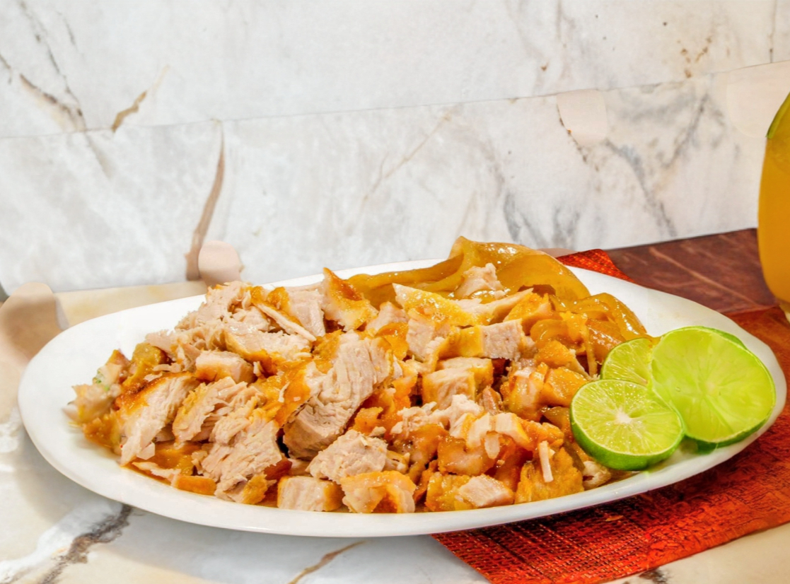 1/2 Kg de carnitas surtidas con tortillas de maiz, pico de gallo, chiles en vinagre y salsa picante.