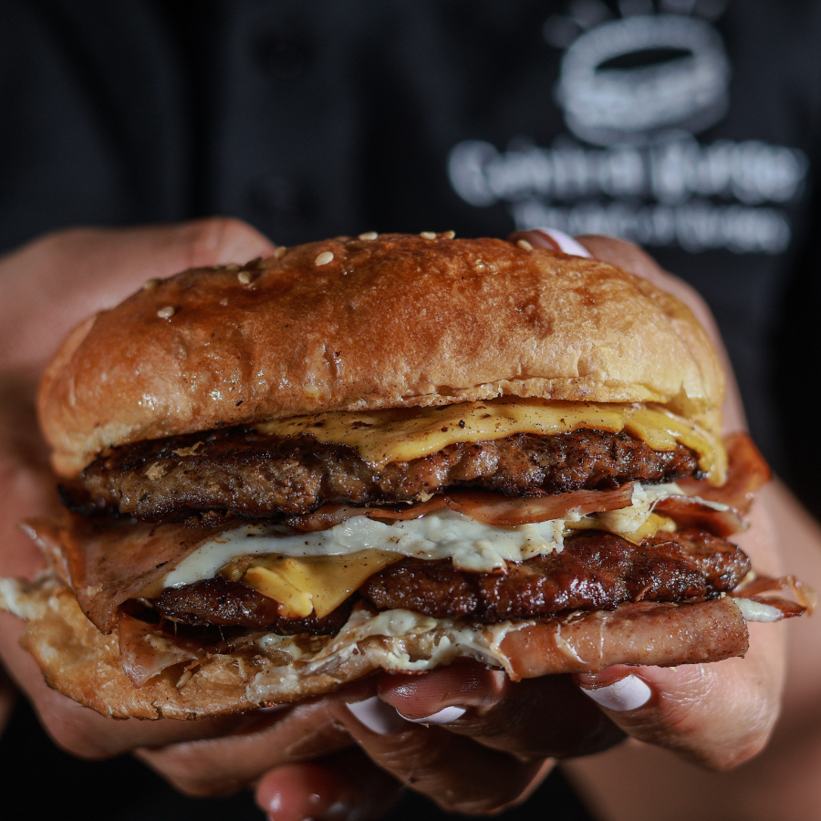 Doble carne, 2 jamón, 2 quesos amarillo, doble queso blanco, jitomate, aguacate, cebolla, jalapeños y aderezos.