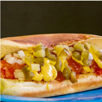 Salchicha. Lechuga, jitomate, cebolla, aderezos y chiles jalapeños.