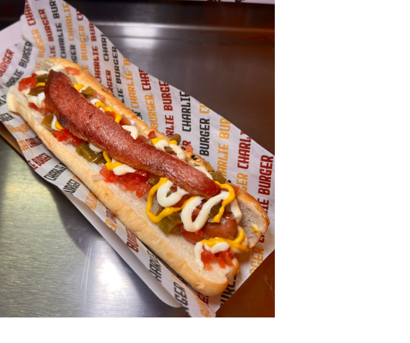 Pan artesanal, salchicha de res, queso gratinado, cebolla, jitomate, chile toreado, mayonesa, cátsup y mostaza.