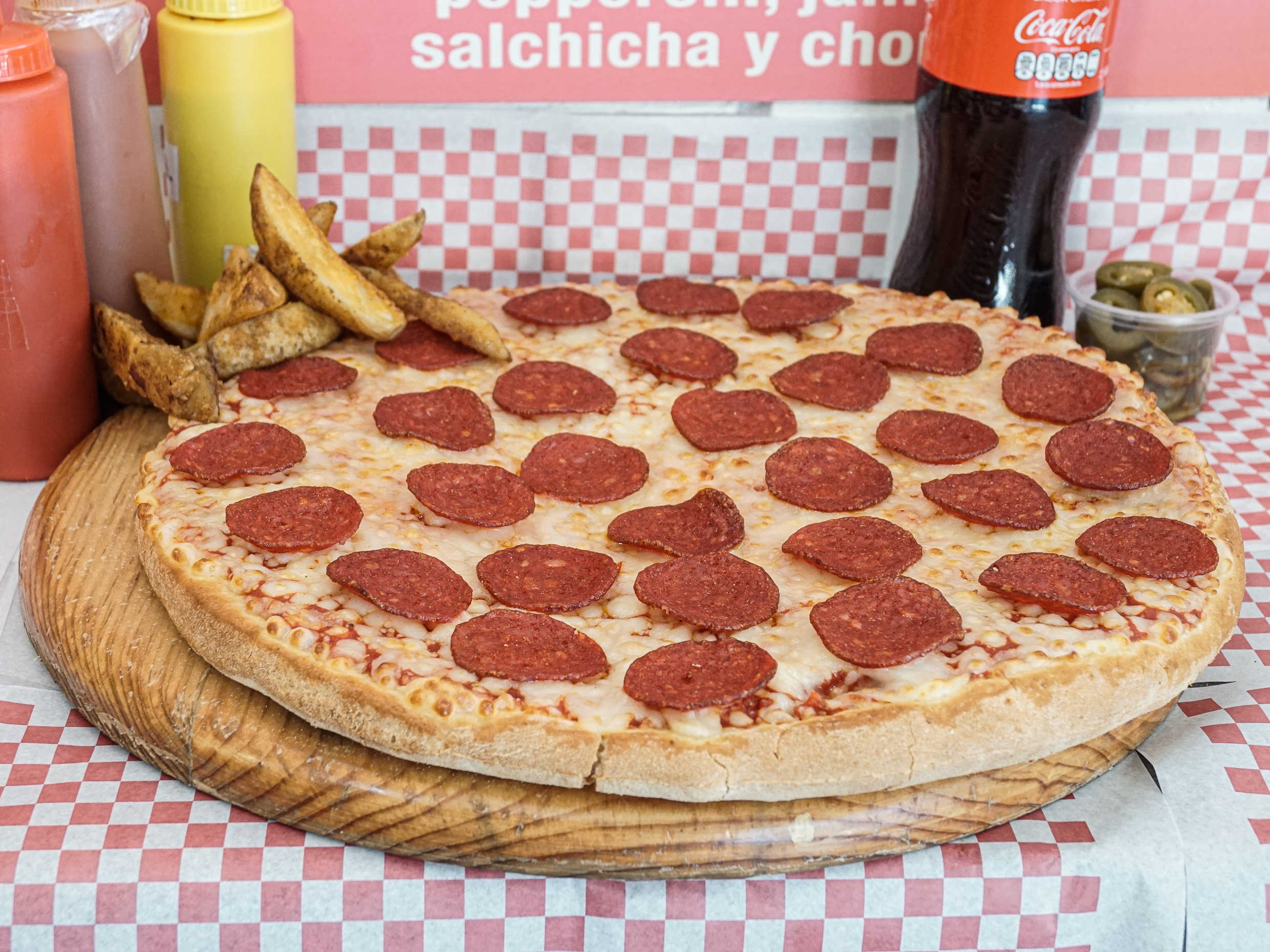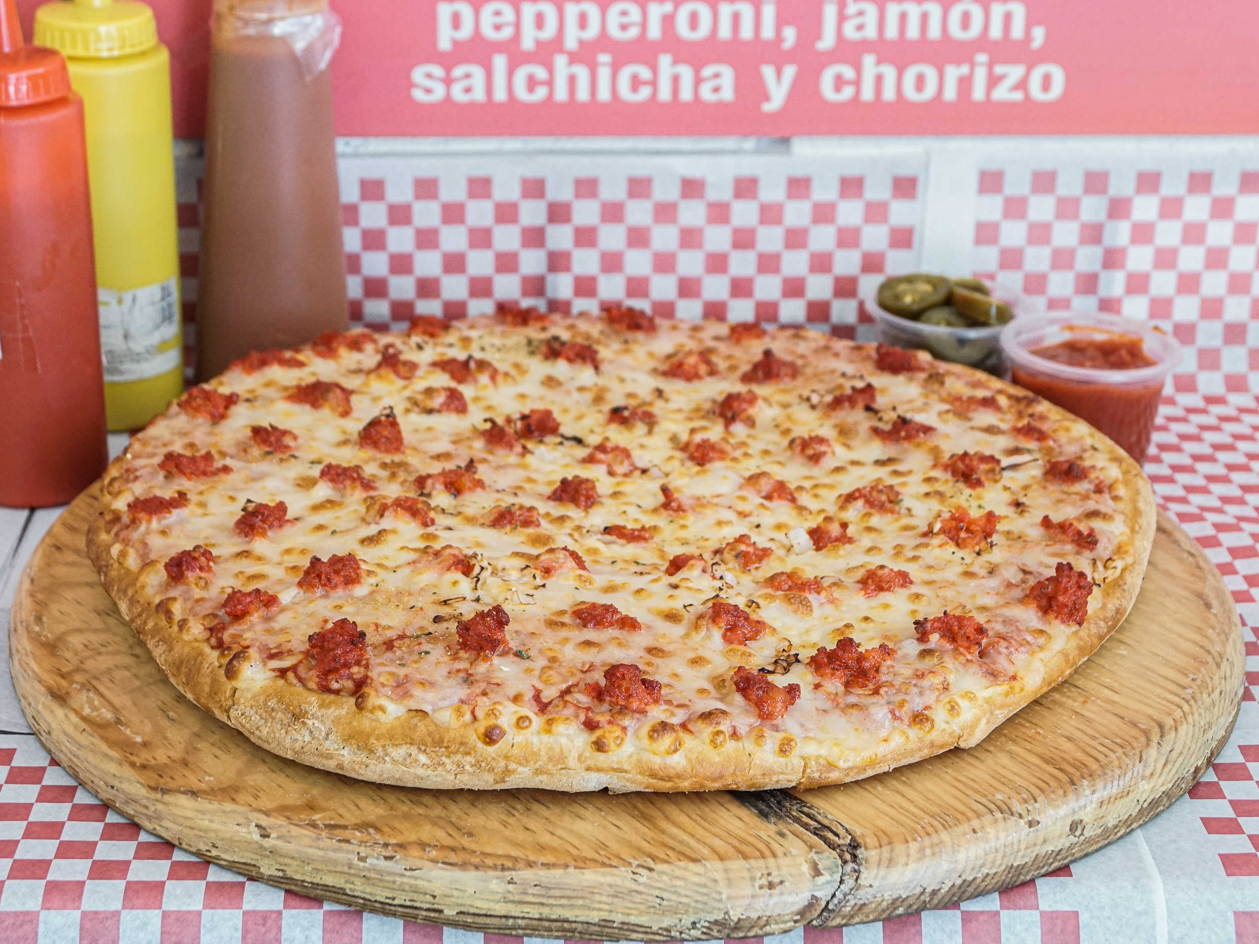 Pizza de 35 cms,Masa delgada artesanal sin borde pero más queso en la orilla, peperoni, jamon, chorizo y salchicha viena.