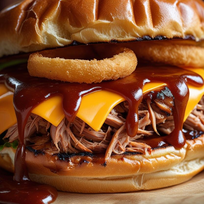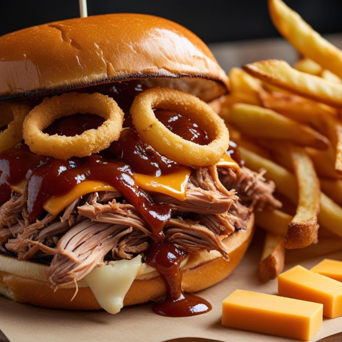 Pulled pork, aros de cebola, queso cheddar, bbq ahumada.