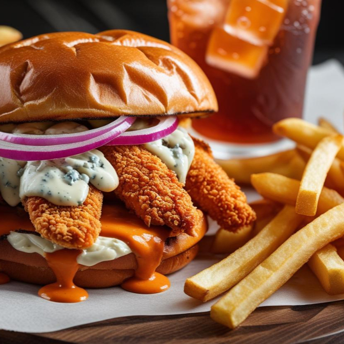 Tenders pechuga de pollo, aderezo blue-cheese, salsa bufalo.