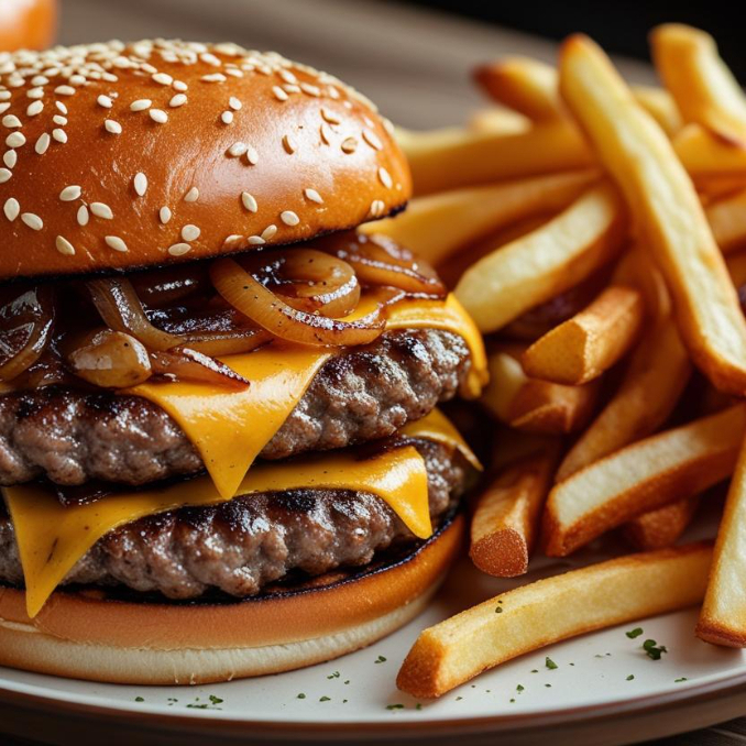 Smarsh burguer doble, cheddar, cebolla caramelizada, salsa especial CB.