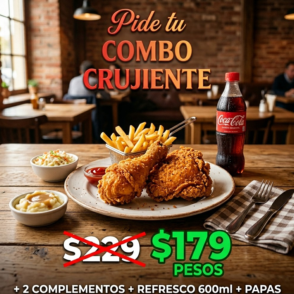 Crujiente por fuera, jugoso por dentro 🤤2 piezas de pollo recién hecho + 2 complementos caseros a elegir.
