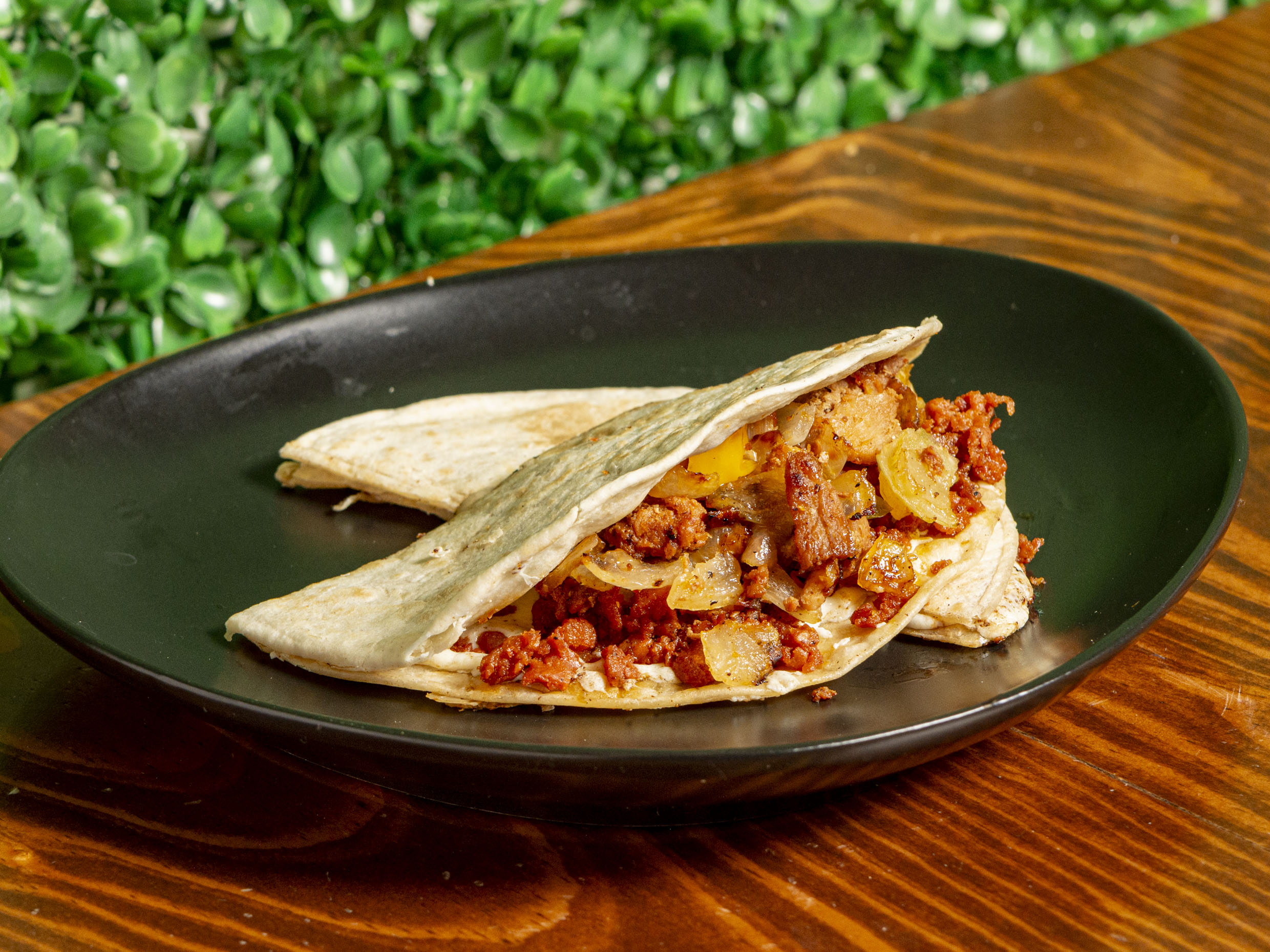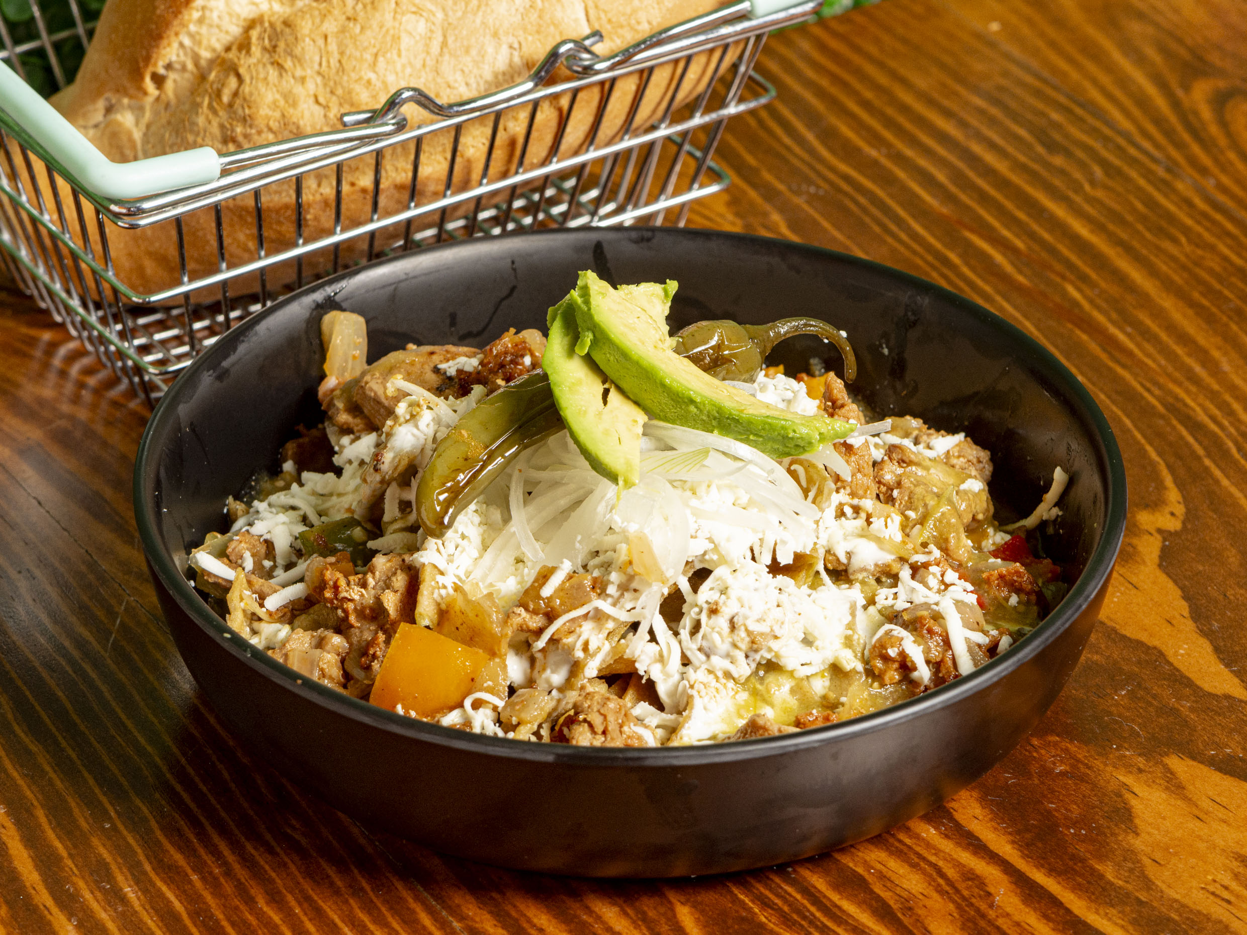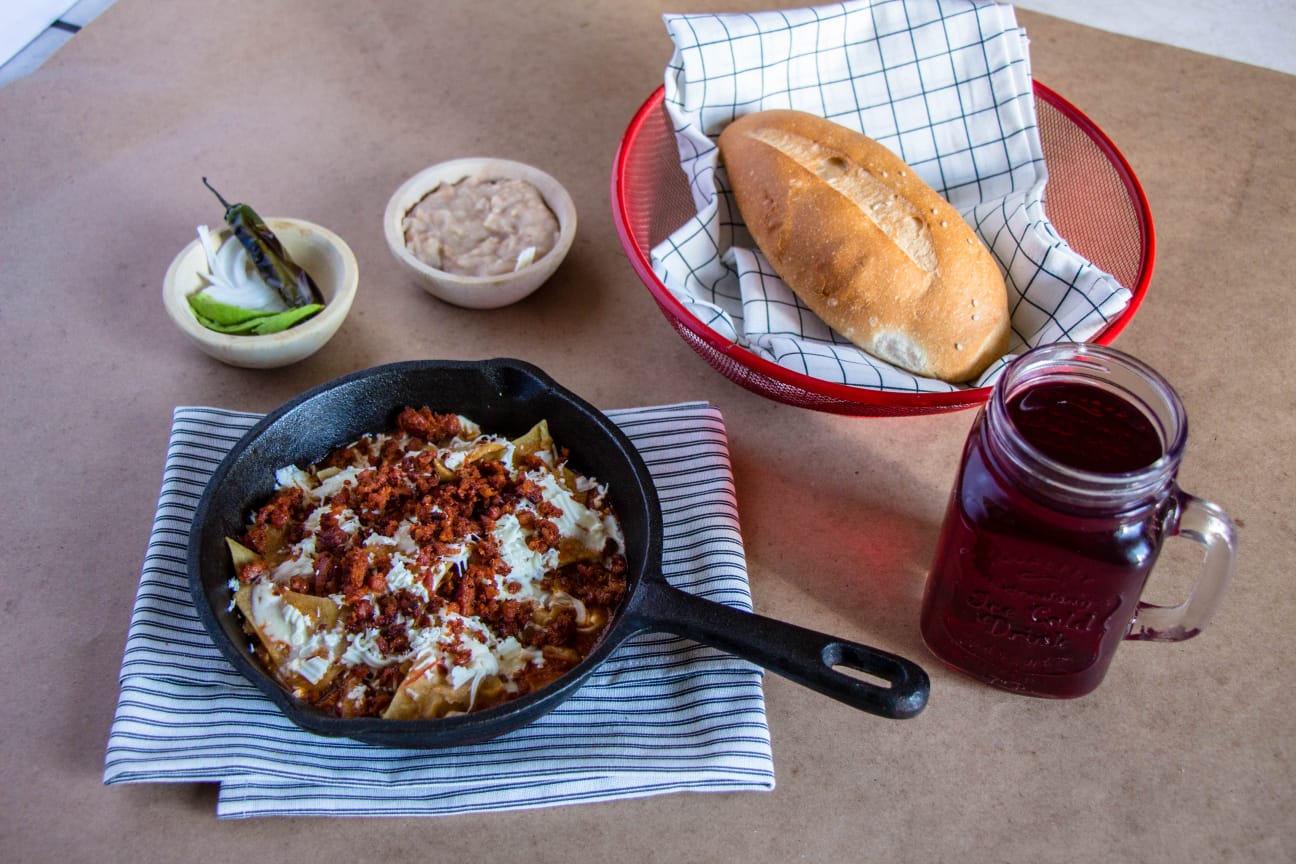 CHILAQUILES PAPA CON CHORIZO + AGUA DE JAMAICA