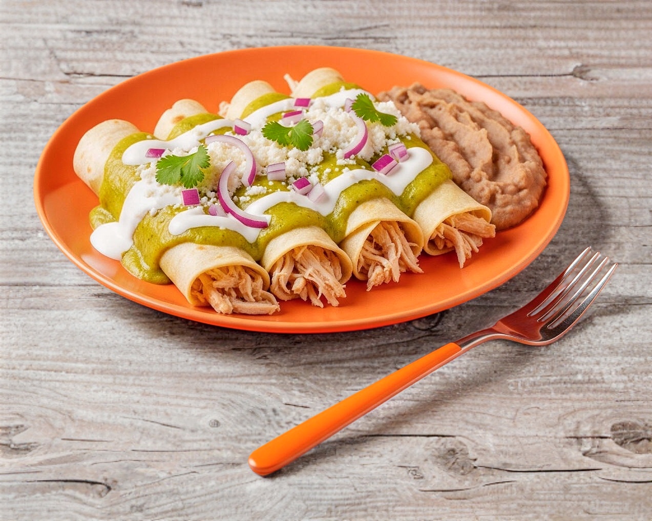 4 enchiladas rellenas de pollo deshebrado, incluye porción de frijoles y van acompañadas de queso ,crema y cebolla
