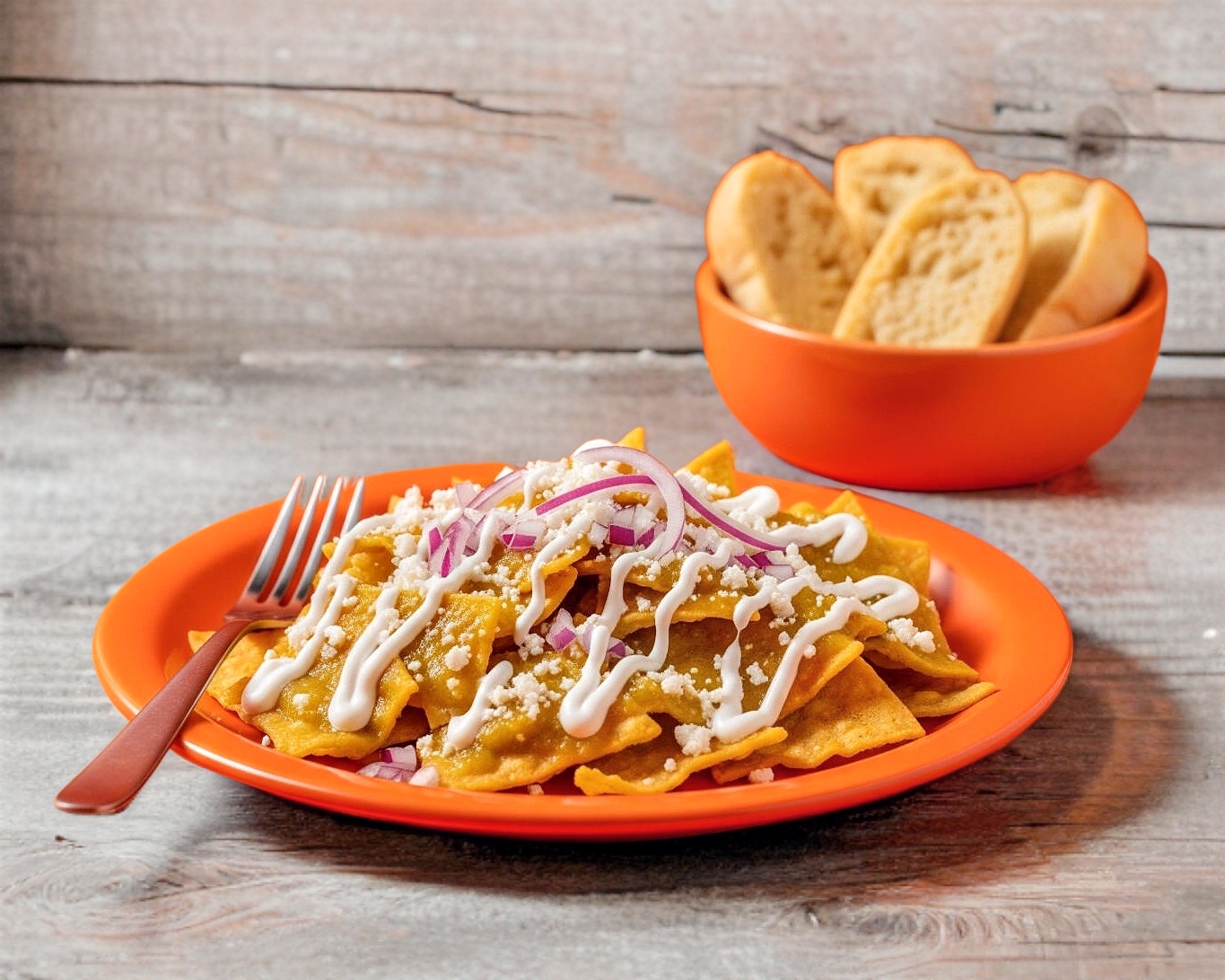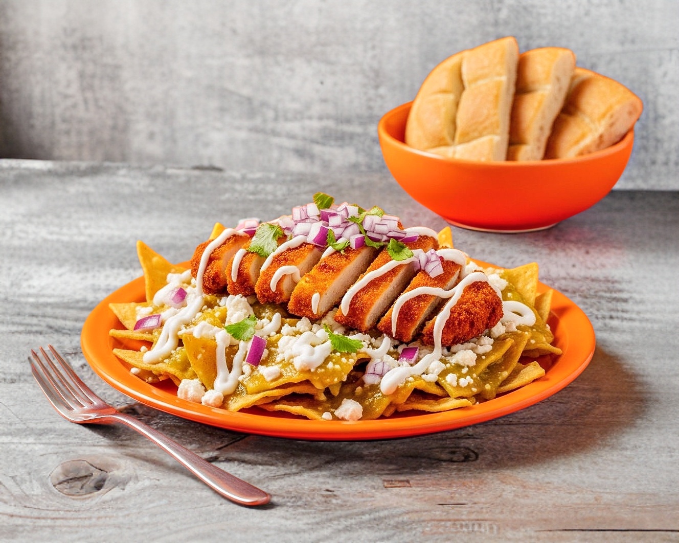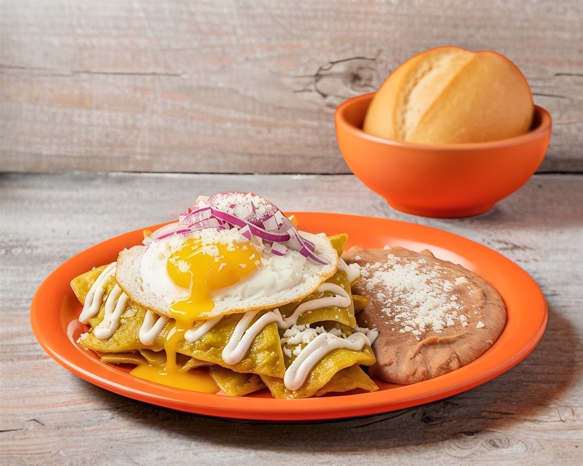 Totopos bañados en la salsa de tu elección, acompañados de frijoles refritos, la proteina de tu eleccion, crema queso cebolla y medio pan