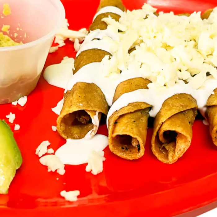 4 Tacos dorados acompañados de crema, queso y nuestra salsa especial picosa.