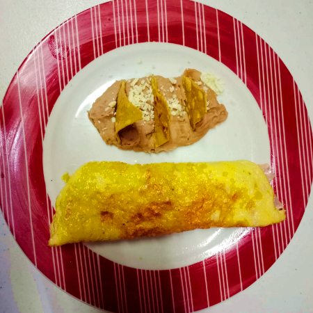 Delicioso Omelette relleno de Champiñon y queso, acompañados de frijolitos con queso, 3 tortillas y salsa del dia.