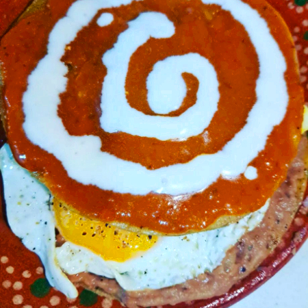 Dos huevos estrellados, en una base de tortilla con frijoles, cubierta por otra bañada en salsa roja, con un toque de crema. Simplemente deliciosos.