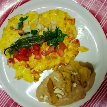 Deliciosos Omelettes rellenos de jamón y queso. acompañado de frijoles con totopos, 3 tortillas y salsa del día.