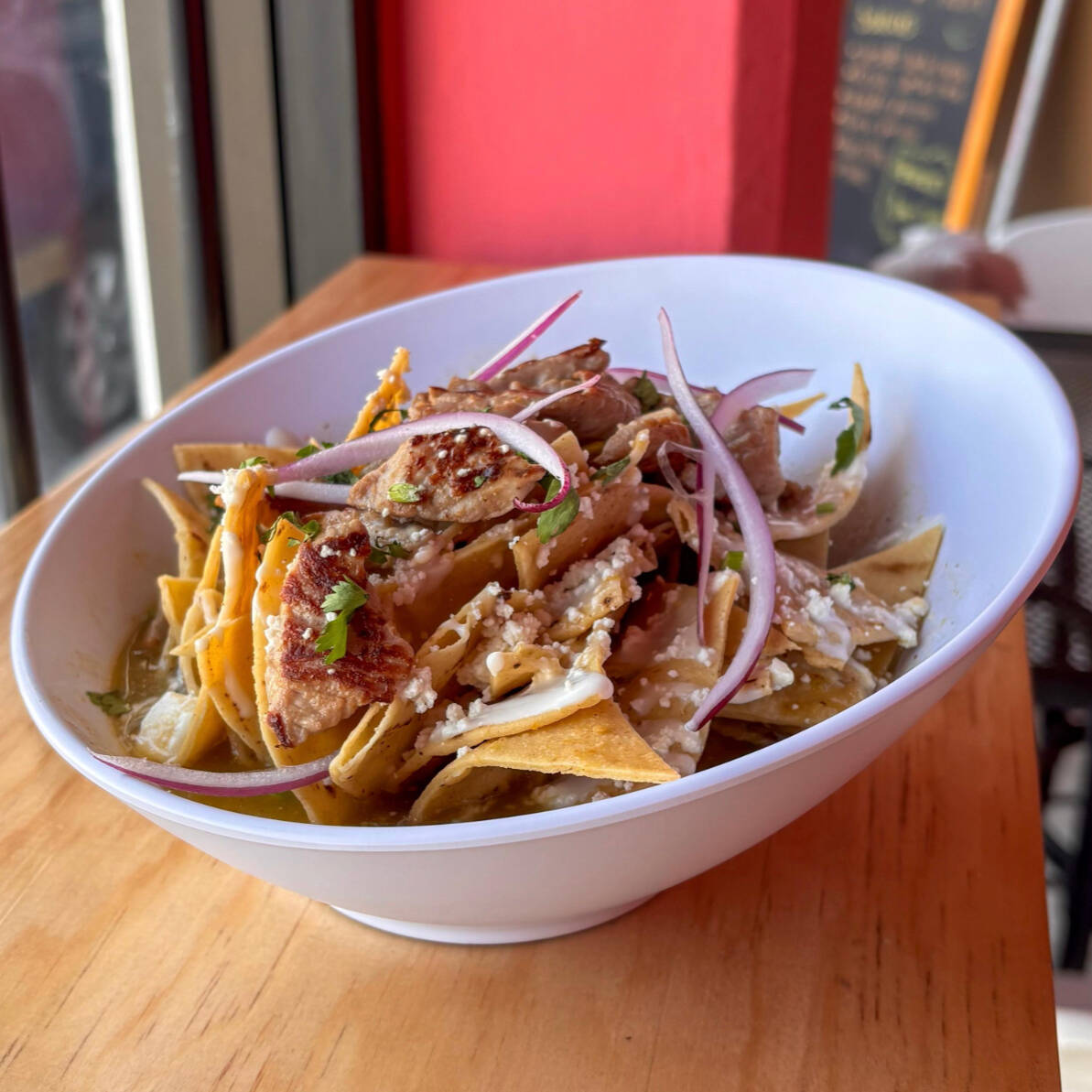 110 gr de totopos bañados en salsa a elección, acompañados de queso ranchero, crema, frijoles refritos, cebolla fileteada, una pizca de cilantro, cecina y agua de sabor el dia.
