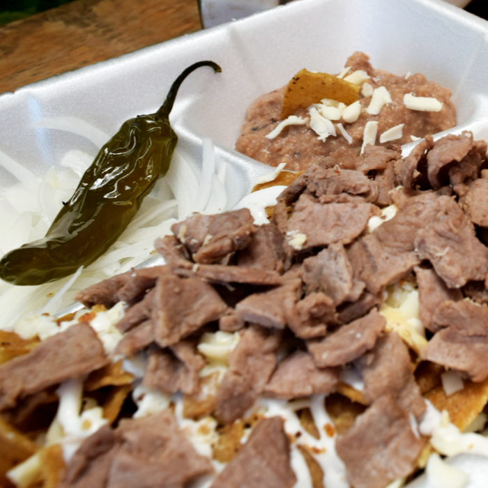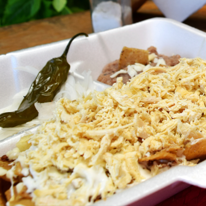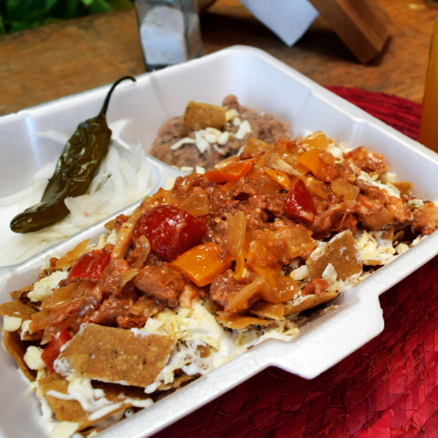 Crujientes totopos bañados cona salsa de tu elección, con queso y crema, acompañados de frijolitos, cebolla, chile toreado, aguacate y pancito.
