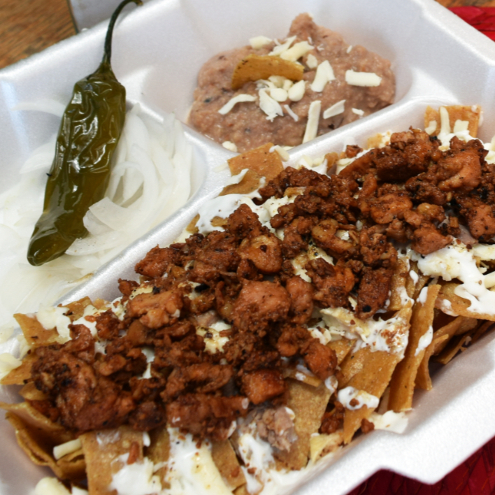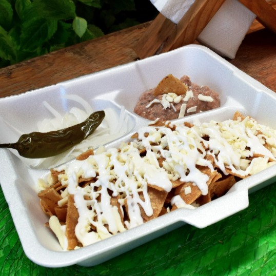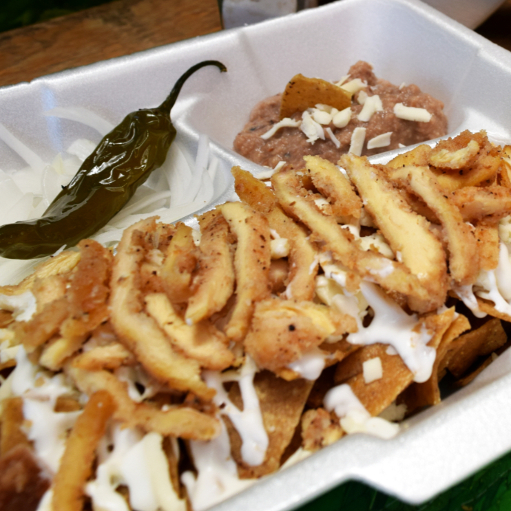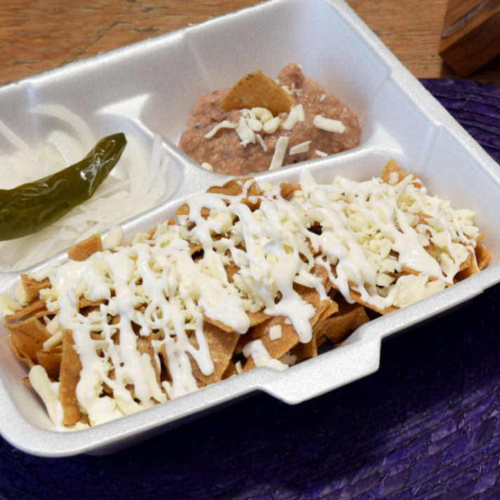 Crujientes totopos bañados cona salsa de tu elección, con queso y crema, acompañados de frijolitos, cebolla, chile toreado, aguacate y pan bolillo.
