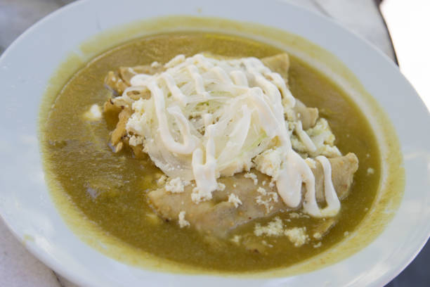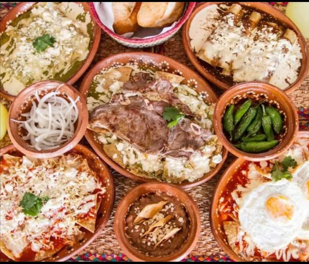 Totopos bañados con salsa de su elección, queso, crema, acompañado de porción de frijoles, cebolla, chile toreado, una pieza de pan bolillo.