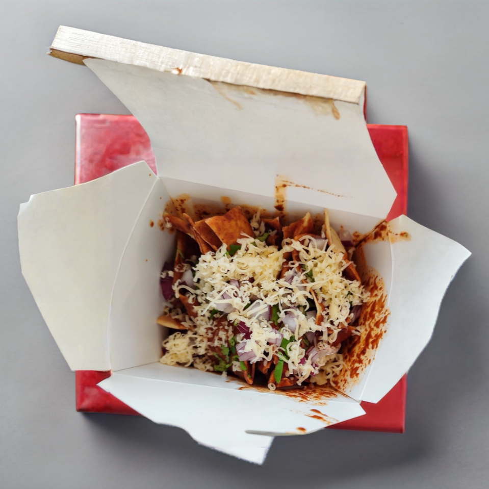 Aproximadamente 1/2 kg de chilaquiles con la salsa roja, pueden ir acompañados si lo deseas de crema, queso, cebolla morada, cilantro, habanero picado y bolillo. Si gustas también les puedes agregar pollo, huevo, arrachera o carnitas.