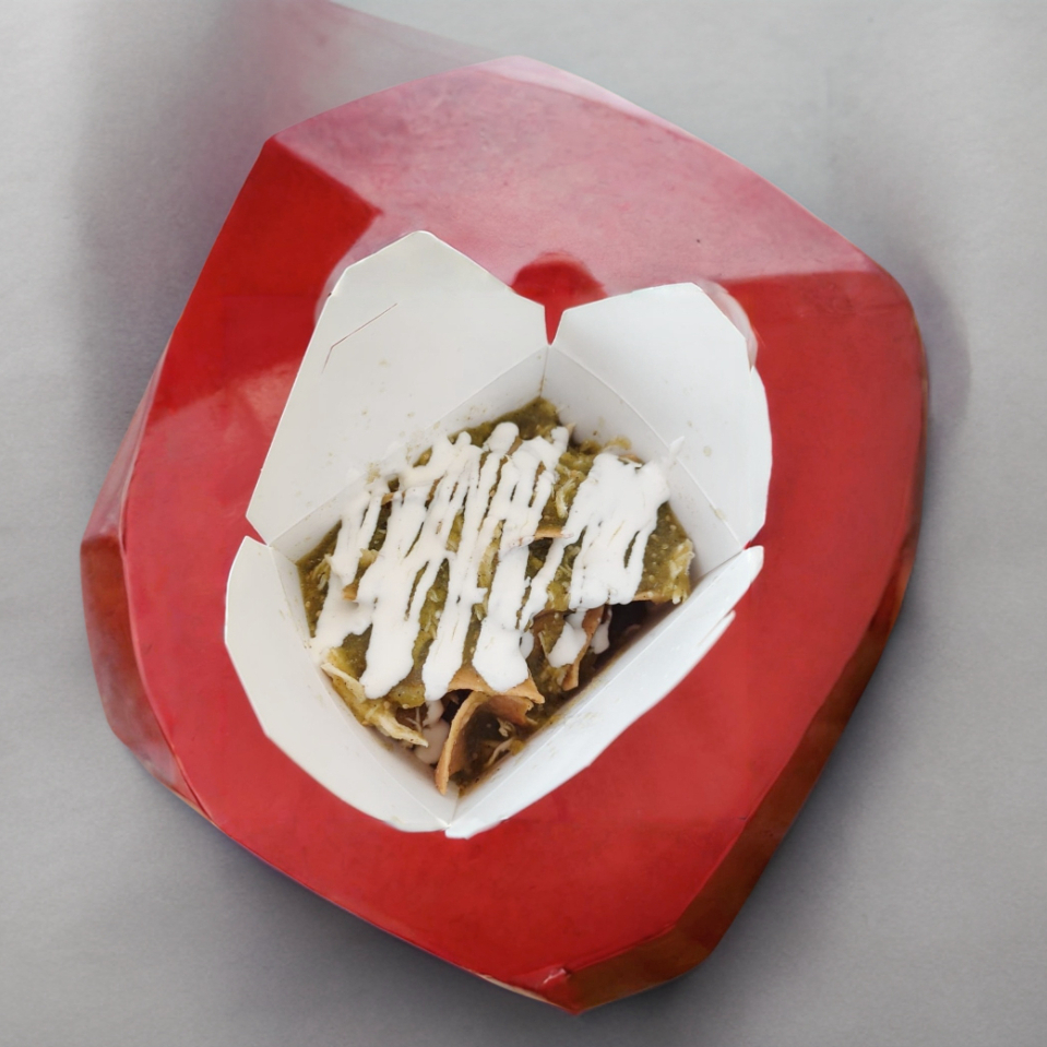 Aproximadamente 1/2 kg de chilaquiles con la salsa roja especial (roja cremosa). Pueden ir acompañados si lo deseas de crema, queso, cebolla morada, cilantro, habanero picado y bolillo. Si gustas también les puedes agregar pollo, huevo, arrachera o carnitas.