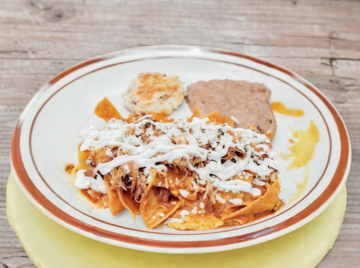 Chilaqui.es grandes con cecina acompañado de bolillo