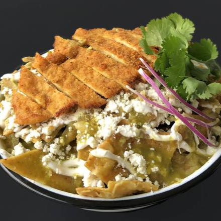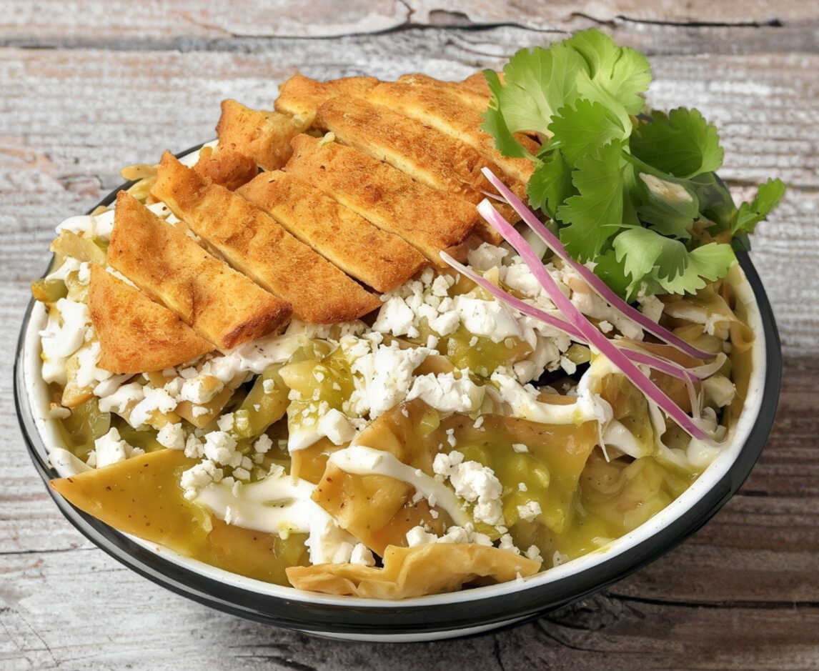 Chilaquiles grandes con milanesa acompañado de bolillo