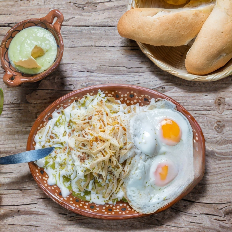Acompañados de 120 grs de picadillo, pollo deshebrado y 2 huevos estrellados. totopos de tortilla de maíz frita bañada con salsa verde y manchego.