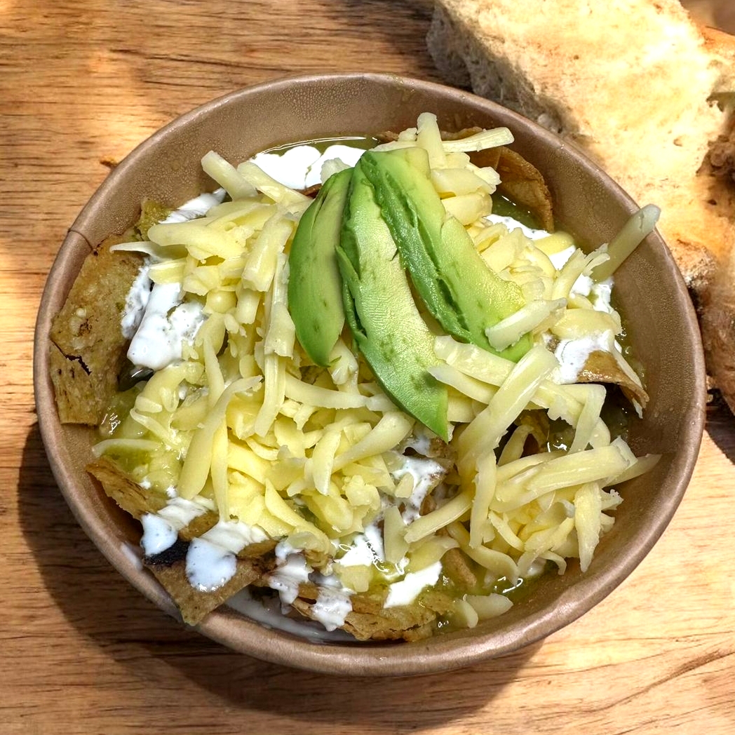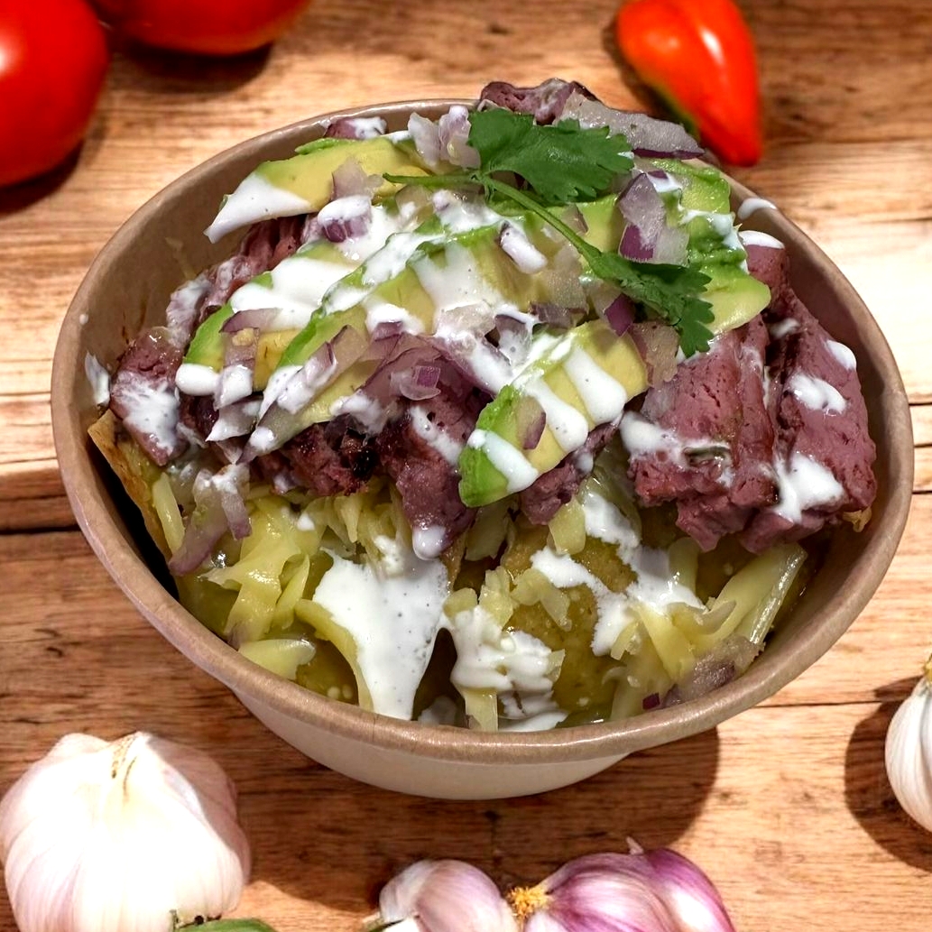 crujientes totopos bañados en nuestras deliciosas salsas y sabroso pollo, acompañados con tus topings favoritos ( queso, crema, cebolla, cilantro, aguacate)