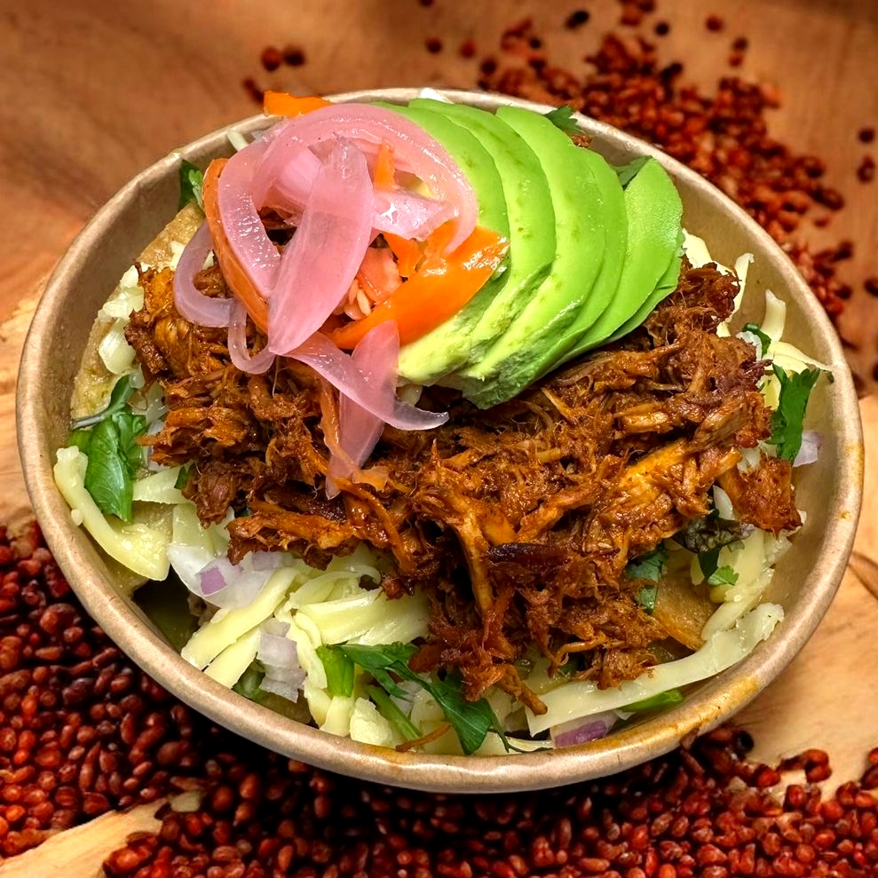 Totopos crujientes bañados artesanalmente con nuestras salsas de la casa con deliciosa porcion de Sabrosa Cochinita Pibil al estilo Sureste.
