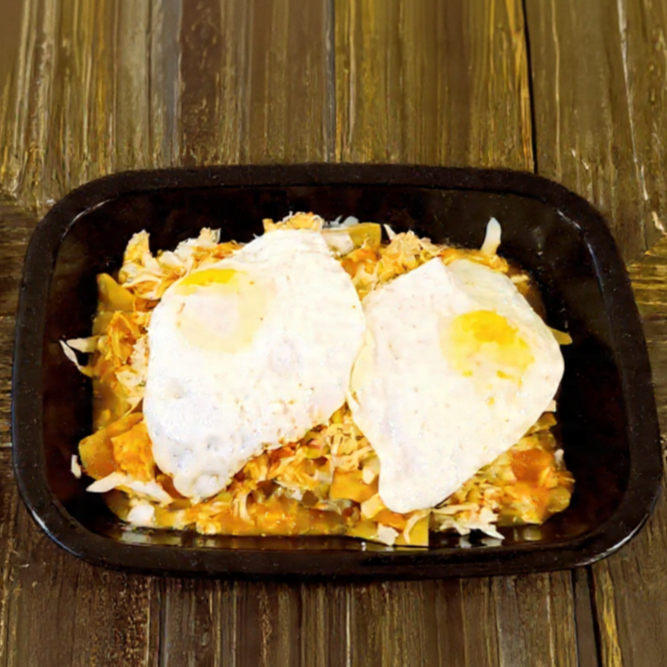 Se sirven con huevo estrellado o revuelto, salsa verde, salsa roja o mole incluyendo frijoles, aguacate y un bolillo.