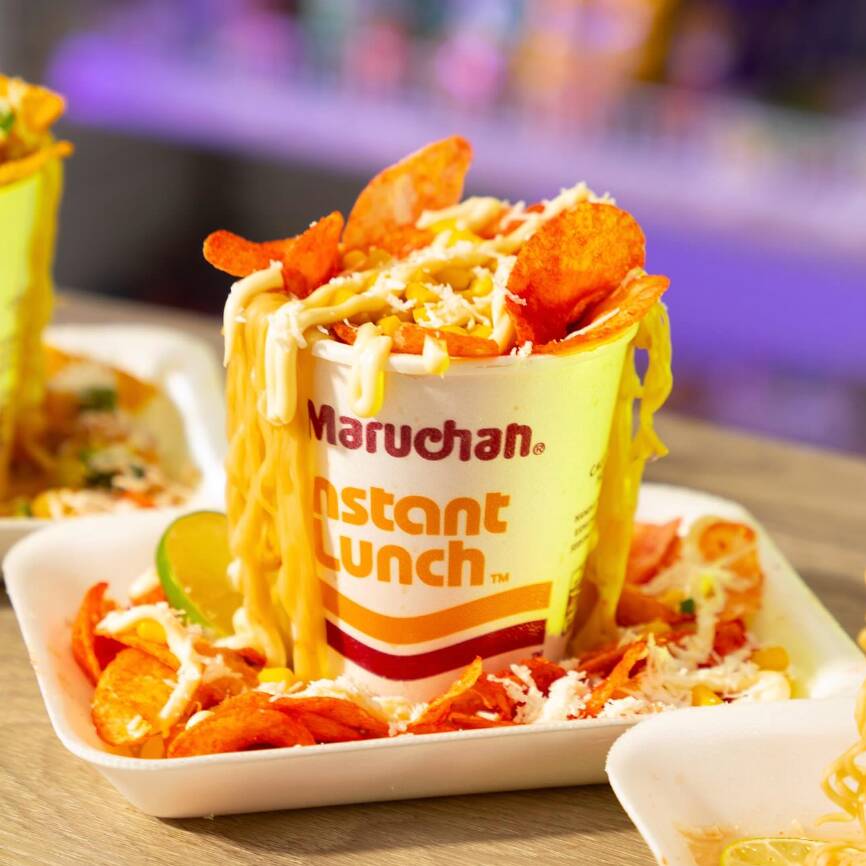 Maruchan preparada con esquite, queso amarillo, queso rayado, mayonesa , limon, cacahuates y fritura a eleccion.