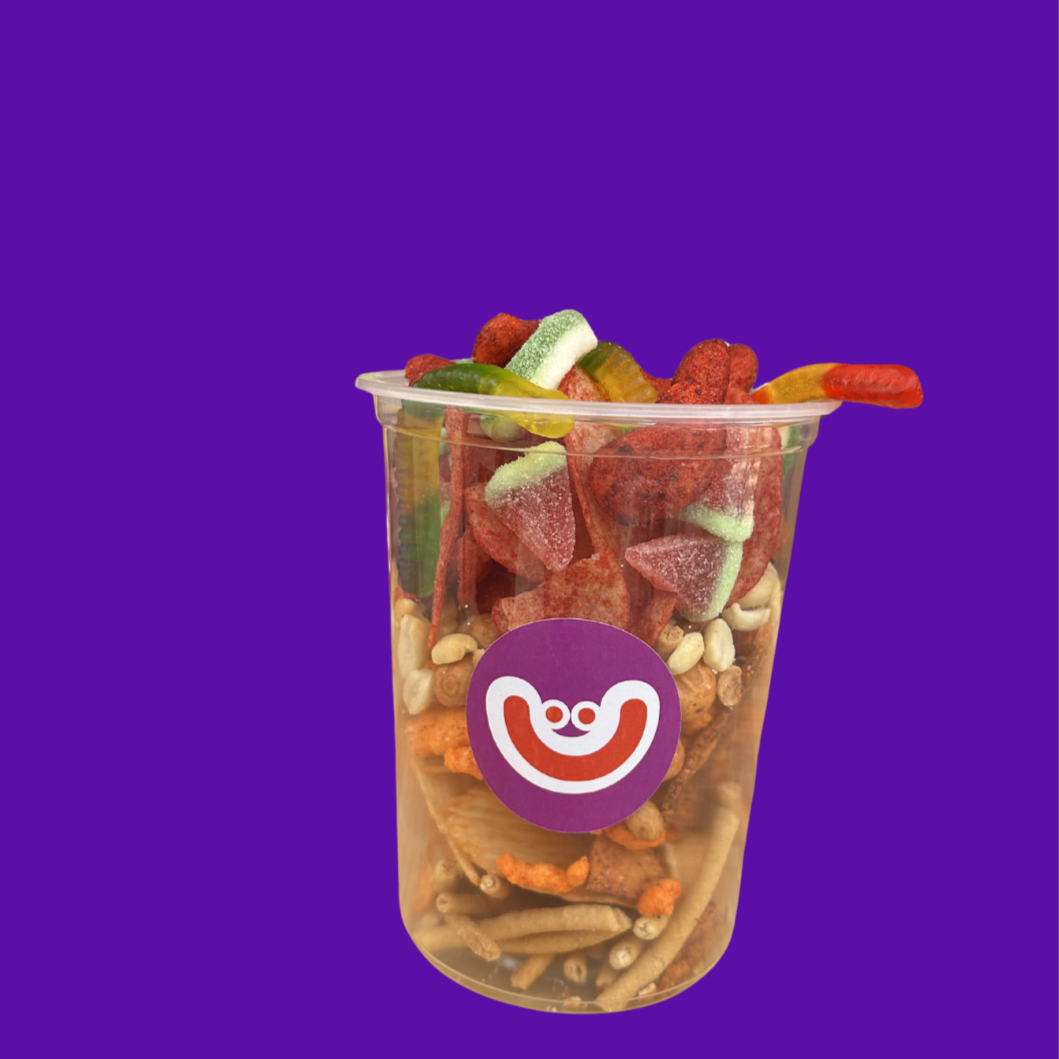 Mezcla de papas, frituras, cacahuates, verduras y gomitas preparadas al gusto.