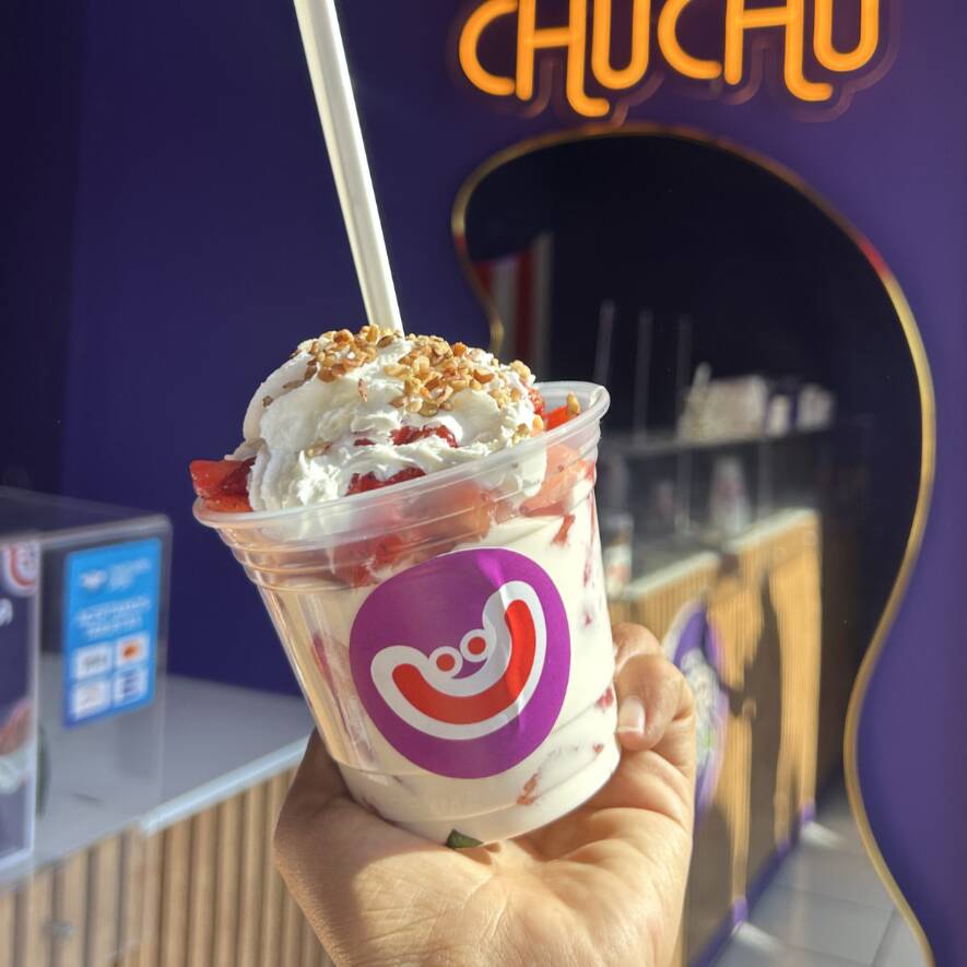Fresas con crema, Nutella, queso bola rallado entre capas y trocitos crujientes de moreliana.