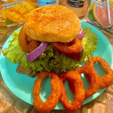 Carne (100% res 🐄), Jamón 🥓, Tocino 🥓, Aros de Cebolla 🧅, Queso amarillo 🧀, Queso manchego 🧀, Verduras🍅🥑🥬🧅🌶