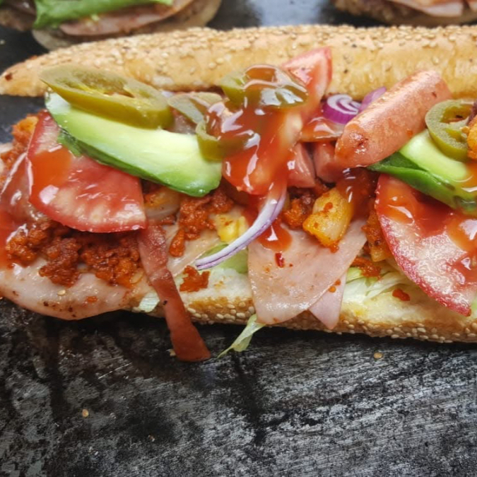 Pierna Adobada (Carne de Puerco deshebrada marinada en Chile Guajillo), Jamón, Queso amarillo, Queso Manchego,Verduras 🍅🥑🥬🧅🌶
