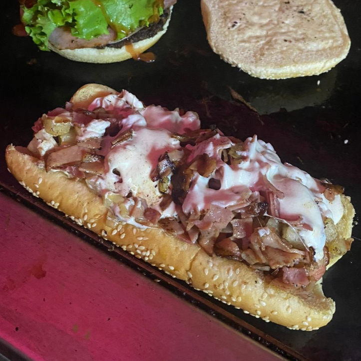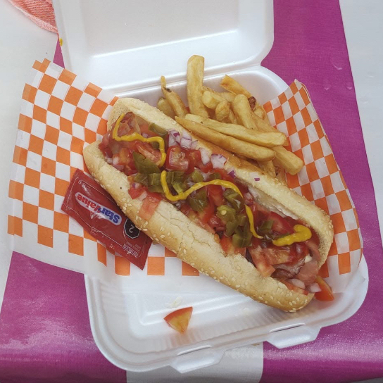 Hot-Dog Gigante 🌭, Salchicha, Queso Oaxaca 🧀, Queso Manchego 🧀, Tocino 🥓, Jamón 🍖, Piña 🍍,Verduras 🍅🧅🌶
