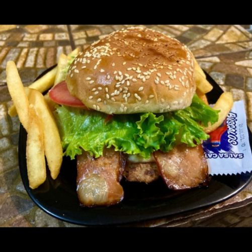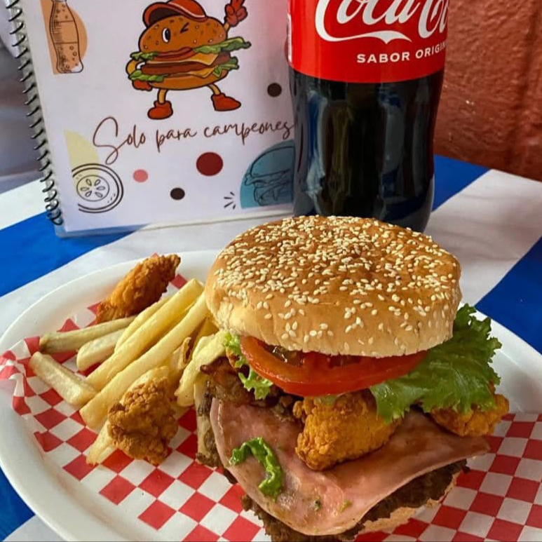 Doble Carne (100% res 🐄), Jamón 🥓, Tocino 🥓, Queso amarillo 🧀, Queso manchego 🧀,Verduras 🍅🥑🥬🧅🌶