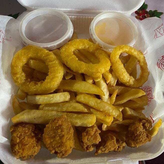 Papas fritas acompañadas de Boneless (8 piezas) y Aros de cebolla (3 piezas). Aderezos a elegir: Naturales, Bbq, Bbq Chipotle, Bbq Hot, Mango Habanero, Queso Parmesano