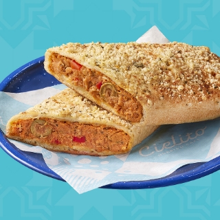 ¡CHI LO QUIERES! Pan relleno de chilaquiles rojos con pollito y queso crema, con costrita de parmesano.