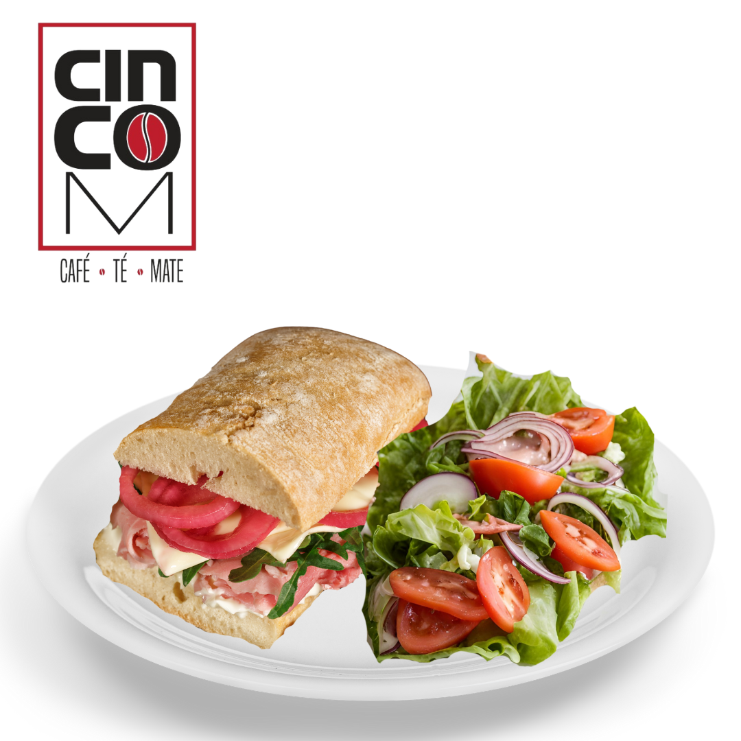 Mezcla de lechuga, jamón de pavo, queso gouda, jitomate, pimiento morrón, crotones y aderezo cesar.
